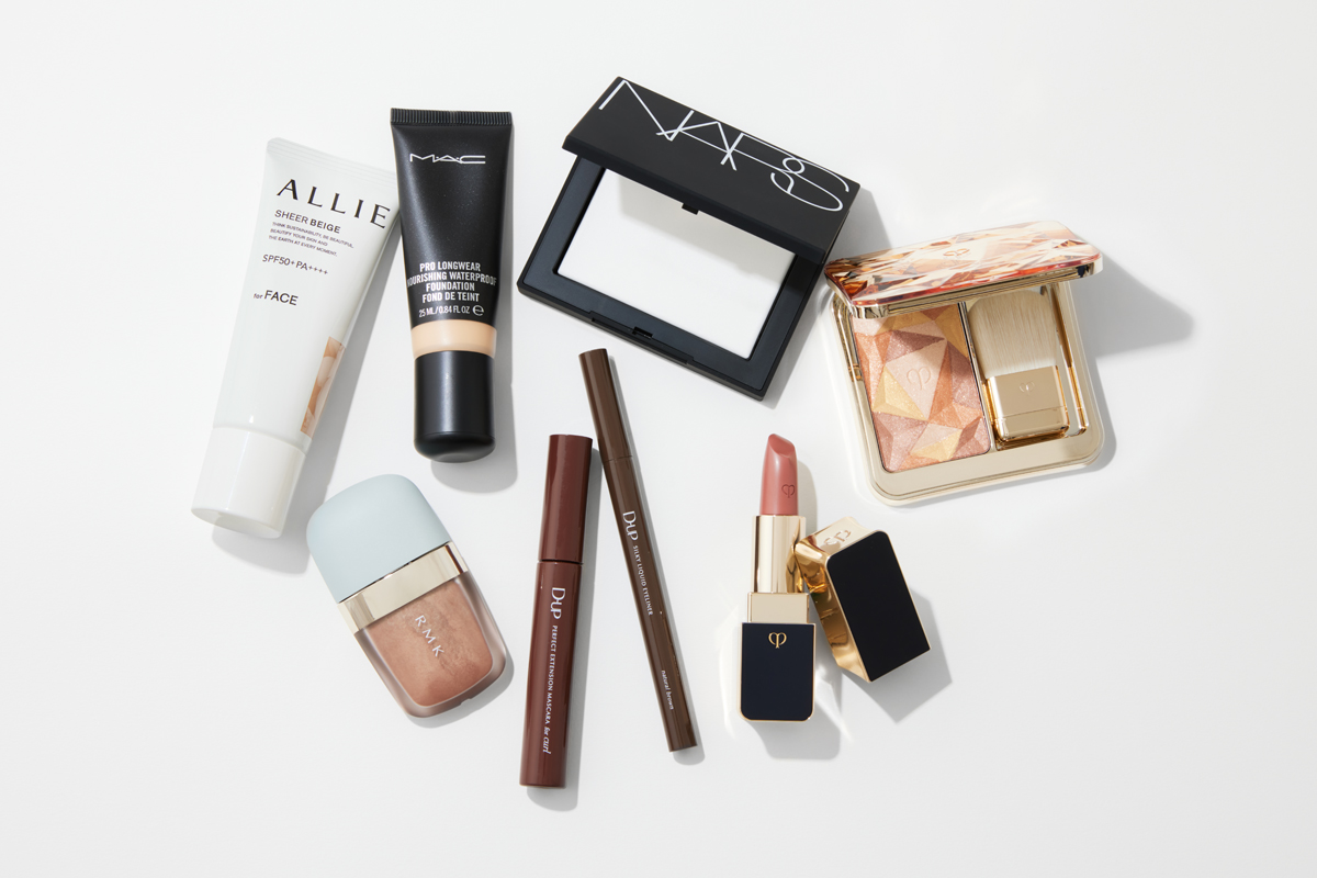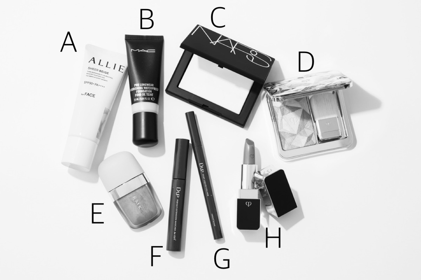 A.強力UVカットしながら、くすみや色ムラなど色補整も。海に入る日の日焼け止めは、ビーチフレンドリー処方を選びたい。アリィー クロノビューティ カラーチューニングUV 03〈SPF50+/PA++++〉40g ¥1,980 ※編集部調べ(カネボウ化粧品) B.ウォータープルーフかつオイルフリーで、汗や水による崩れを防ぐ! プロ ロングウェア ウォータープルーフ ファンデーション 全7色 26g ¥5,390(M·A·C) C.光を反射して肌の透明感がUP。小ジワや毛穴などをカバーしながら、テカリを抑えて肌表面をサラサラに。NARS ライトリフレクティングセッティングパウダー プレスト N 5894 10g ¥5,500(NARS JAPN) D.揺れ動く多彩な光を放つ、天然宝石と同じ性質を持つハイライティングパウダー。ブロンザー効果で立体感も! クレ・ド・ポー ボーテ ル・レオスールデクラ 22 10g ケース・ブラシ付き¥9,350(クレ・ド・ポー ボーテ) E.微細なパールを忍ばせたリキッドタイプのアイシャドウ。粉っぽさがなく、透け感のあるゴールデンベージュ。RMK リクイドアイズ 04 ¥3,850(RMK Division) F.ほんのり赤みブラウンで目元に抜け感。ウォータープルーフで安心。パーフェクトエクステンションマスカラ for カール チェリーブラウン ¥1,650、G.ラインを描いた瞬間に肌に密着し、表面をコート。にじまない! シルキーリキッドアイライナー ナチュラルブラウン ¥1,430(ともにディーアップ) H.肌色をくすませず、ちゃんと血色感のあるベージュピンク。クレ・ド・ポー ボーテ ルージュアレーブル 11 ¥6,600(クレ・ド・ポー ボーテ)