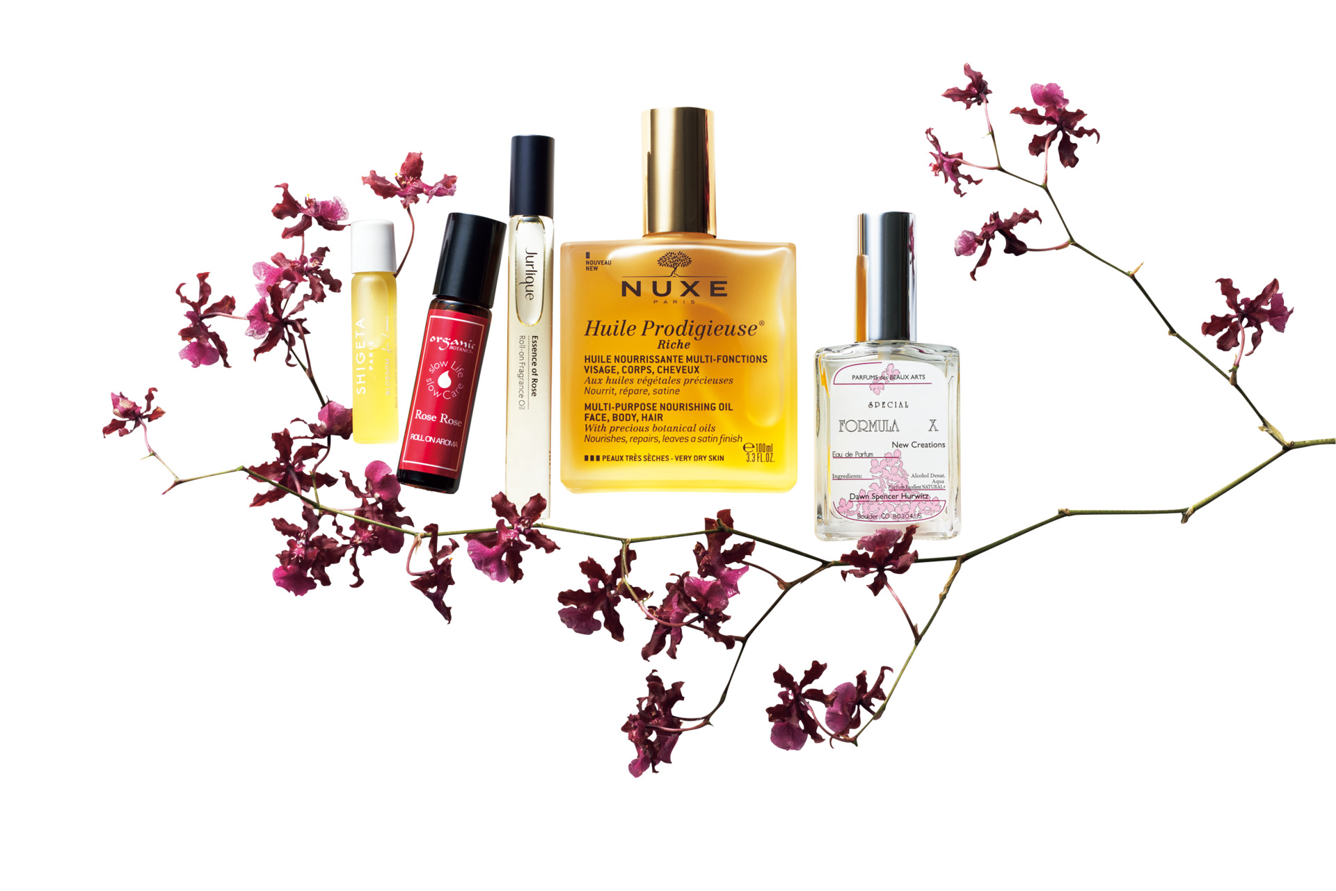 ❶天然素材主体のナチュラルパフューム。その人の肌自体の香りを引き出す、ブランドの特徴的なフレグランス。ダウンパフューム フォーミュラエックス 30㎖ ¥10,500(デュード)❷ボディやヘアケアできるマルチオイルのリッチ版。シンボリックなフローラルの香りはメンズに好評。ニュクス プロディジューオイル リッチ 100㎖ ¥5,800(ブルーベル・ジャパン)※限定発売中❸フレッシュで青みのあるフレグランス。ローズ フレグランスオイル ロールオン 10㎖ ¥2,500(ジュリーク・ジャパン)❹ネイルにも使えるオーガニックオイル。女性らしさ高まるローズ。オーガニックボタニクス ロールオンアロマ ローズローズ 10㎖ ¥2,300(リッチフィールド)❺つけるだけでモテる! 婚活オイルと異名をとるほど数々の実績を持つ香り。シゲタ ブロッサム for lovers ロールオン 6㎖ ¥1,850(コスメキッチン)