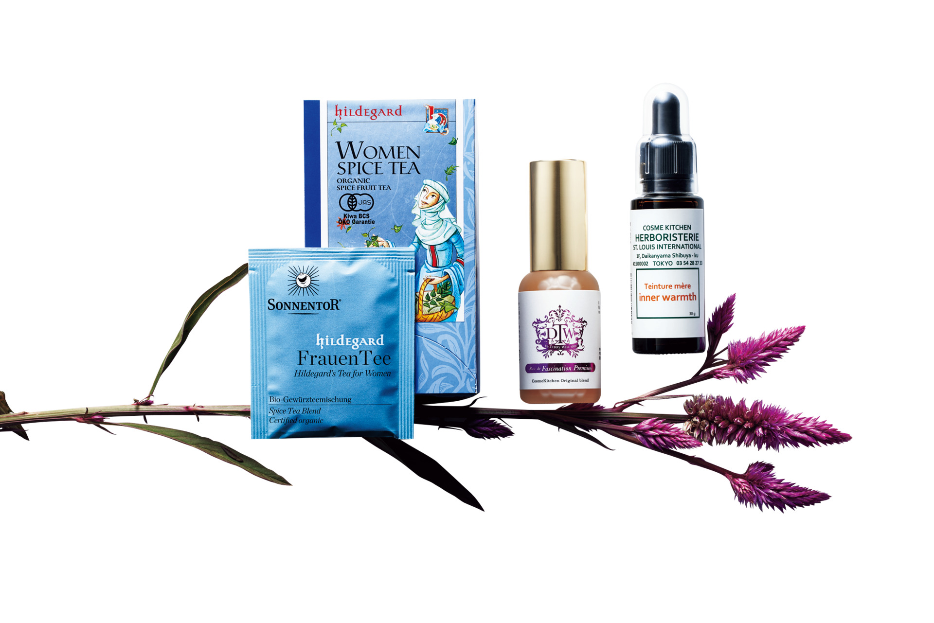 ❶女性ホルモン調整作用のあるハーブをブレンド、月経周期乱れやPMSを緩和。エルボリステリア ブレンドタンチュメール フォーウーマン 30g ¥2,800(コスメキッチン)❷忙しさで忘れがちな〝女性性〟を取り戻し女子力アップ、異性へのアピールを高める。DTW フラワーエッセンス ファシネーション・プレミアム 30㎖ ¥4,800(コスメキッチン)❸生理不順や月経痛を和らげ気分を明るく。ゾネントア ヒルデガルト 女性のためのお茶 18包 ¥900(おもちゃ箱)