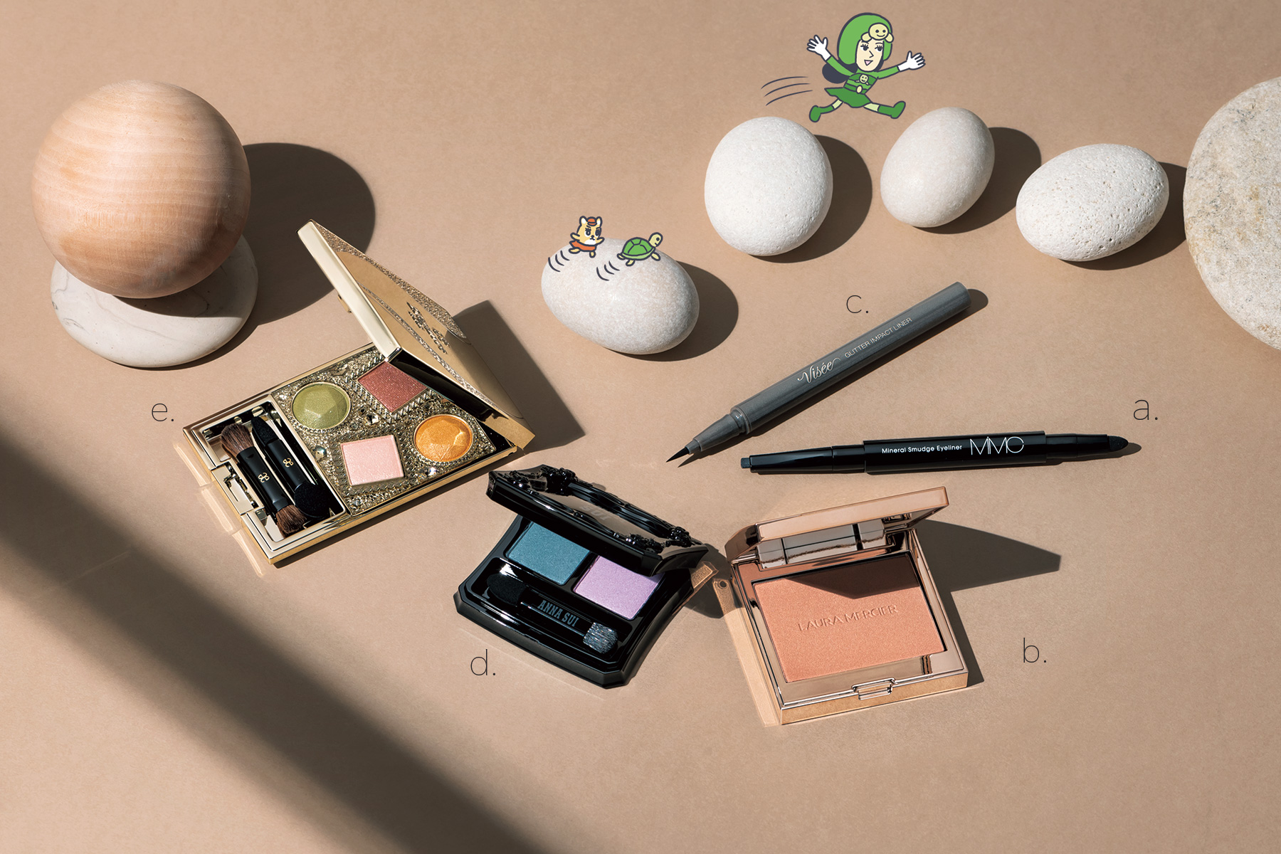 a「繊細なパール感で意外となじませやすいスモーキーグレー」ミネラルスマッジアイライナー 01¥3,300(MIMC)※8/2発売 b「肌なじみが抜群なシマーピーチは、久しぶりのチークにもってこい」ローラ メルシエ ブラッシュカラー インフュージョンR2¥3,850(ローラ メルシエ ジャパン) c「ブルベの前田ピンク曰く、黄みがかったグレーらしいです。イエベのグレー初心者にも!」ヴィセ リシェ グリッターインパクト ライナー GY010¥1,320[編集部調べ](コーセー)※限定発売中 d「繊細なブルーパール入りで透明感のある眼差しに」アナスイ アイカラーコンパクト 12¥4,400(アナスイ コスメティックス)※8/1発売 e「透明感があるから、深みのある秋色をくすまずに楽しめる!」エレガンス ヌーヴェル アイズ 35¥6,050(エレガンス コスメティックス)※8/18発売