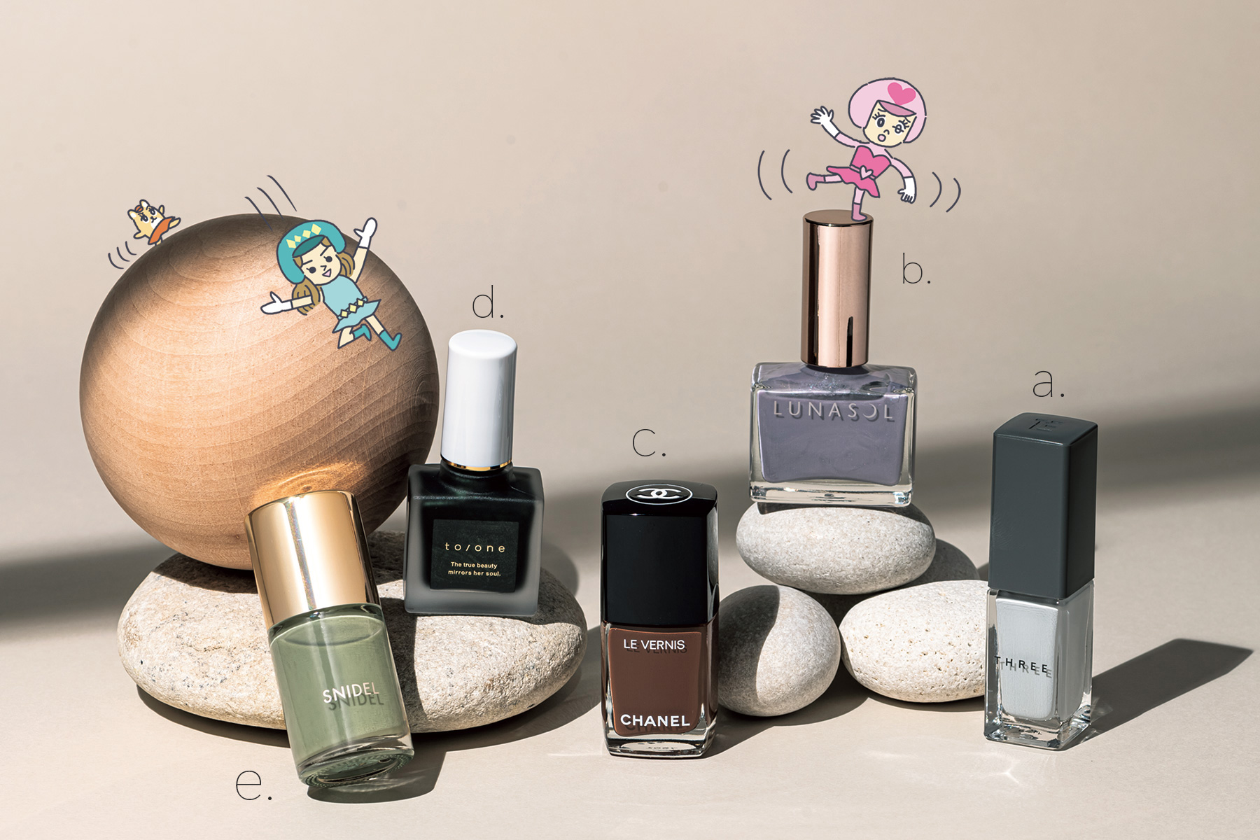 a「晩夏から使いたいのは、くすみ感がスタイリッシュなアイシーグレー。酸素透過性処方で爪の呼吸をキープ」THREE ネイルポリッシュ 133¥1,980 (THREE)※8/3発売 b「やや青みの強いマニッシュなラベンダー。パール感が繊細で、塗りやすさと洒落感を両立」ルナソル ネイルポリッシュ EX27¥2,200(カネボウ化粧品)※9/16限定発売 c「シャネルからこの秋、温かみのあるベージュ系ネイルが全8色登場。包容力のあるハンサムブラウンに注目」ヴェルニ ロング トゥニュ 957¥3,960(シャネル)※8/5限定発売 d「トレンドカラーのグリーンのパールがきらめくブラック。モードなのにどこかサステナ感が漂う絶妙なお洒落色♥」トーン ネイルポリッシュ 12¥1,980(トーン)※8/8発売 e「天然由来成分70%で爪に優しい処方。シアーなカ ーキはイエベの手元もキレイに映える!」SNIDEL グロッシー ポリッシュ EX02¥2,310(SNIDEL BEAUTY)※8/26限定発売