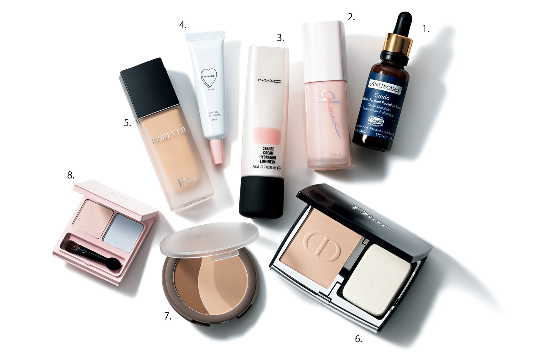 1.乾燥や肌荒れから肌を守る〝発酵〟パワーに着目。みずみずしいジェルタイプの美容液。アンティポディース クレド プロバイオティクス セラム 30㎖ ¥6,380(コスメキッチン)※9/1発売 2.たっぷりのうるおいでスキンケアクリーム感覚で使える、トーンアップ×UV下地。ミシャ グロウ スキン バーム サンベース〈SPF50+/PA++++〉35g ¥2,310(ミシャジャパン)3.ストロボライトを当てたように、パーンと輝く発光肌が手に入る!透明感と明るさを出すのに最適なピンク。ストロボクリーム ピンクライト50㎖ ¥5,280(M・A・C)4.黄みを払って、澄んだ透明感を引き出すブルー。ブルーライトカット効果も。フーミーコントロールカラーベースN ブルー〈SPF21/PA++〉15g ¥1,980(Nuzzle)5.軽やかさとマットな質感を両立した、美容液ベースのリキッドファンデ。ディオール スキンフォーエヴァーフルイド マット全11色〈SPF20/PA+++〉30㎖ ¥7,040 6.肌に溶け込んで粉っぽさを感じさせず、今っぽいセミマット肌へ。ディオールスキン フォーエヴァーコンパクト ナチュラル ベルベット全7色 ¥8,250(ともにパルファン・クリスチャン・ディオール)7.色をミックスすることで、より肌になじみやすくなります。キメ細かいパウダーがなめらかにフィット。リリミュウ シアーマットシェーディング02 ¥1,760(コージー本舗) 8.ラメなしハイライトがナチュラルな立体感を演出。フーミーハイライトパウダーWミルキーブルー¥2,200(Nuzzle)