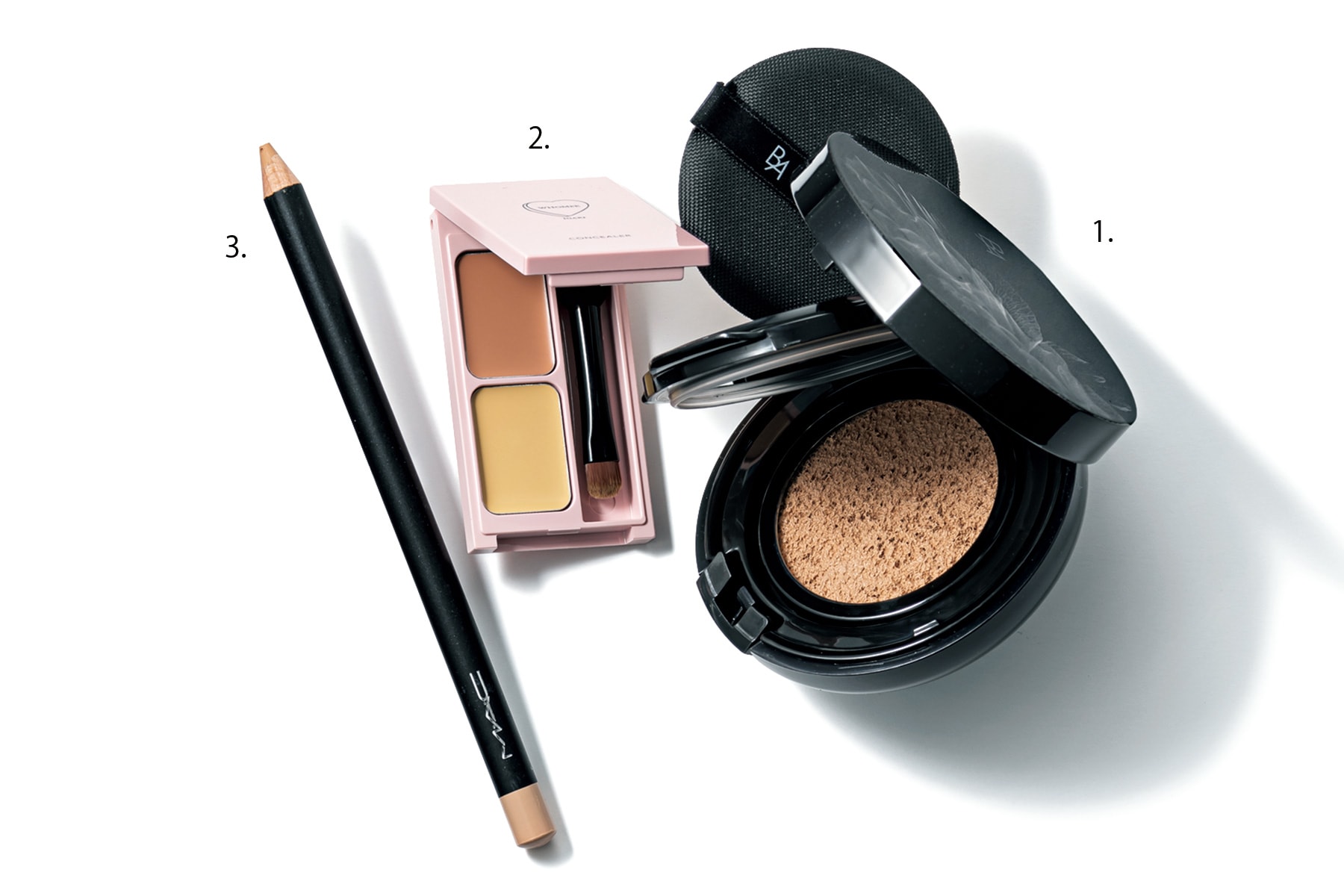 1.化粧水でうるおいをチャージしたように水分力がUPした肌が、ファンデで叶う。B.Aセラムクッションファンデーション全5色〈SPF20/PA++〉12g ¥12,100※パフ付き、ケース別売り¥2,750(ポーラお客さま相談室) 2.めずらしいイエローのコンシーラーに注目!くすみや赤みといった色ムラをマルチにカバー。フーミー キニシーラーライトイエロー¥2,530(Nuzzle) 3.目尻や涙袋、小鼻などの細かい部分のレタッチに使いやすいペンシル型コンシーラー。スタジオ クロマグラフィック ペンシル NW25/NC30 ¥2,640(M・A・C)