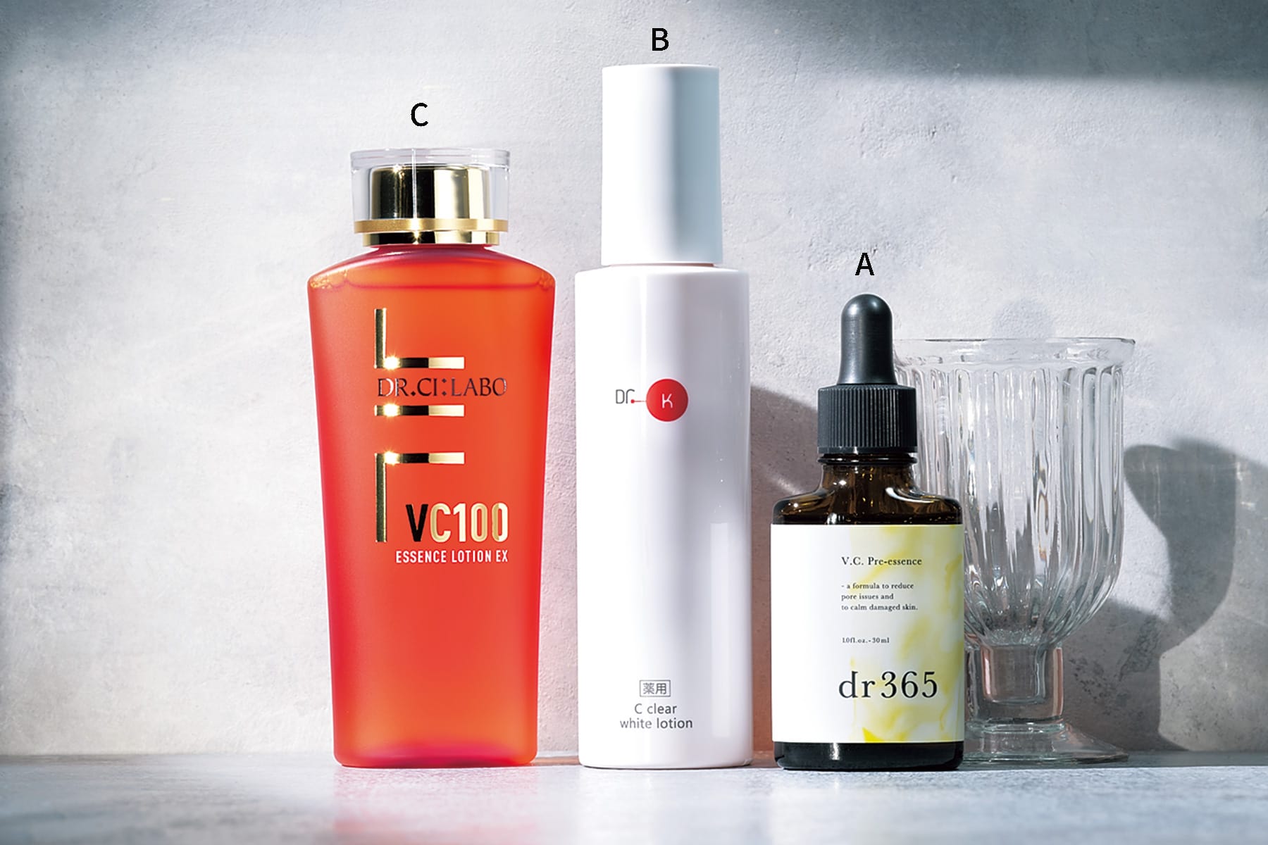 A.〈dr365〉皮膚科医監修の導入美容液。ピュアビタミンCとビタミンC誘導体入りで、毛穴の目立たない透明感のある肌に。大野さんは定期購入するほど愛用中!V.C.プレエッセンス 30㎖¥4,950(dr365)B.〈Dr.K〉ビタミンC誘導体に加え、相乗効果を生み出すグルタチオンやナイアシンアミドを含めた10種のカクテルビタミンを配合。ドクターケイ薬用Cクリアホワイトローション120㎖[医薬部外品]¥5,940(ドクターケイ)C.〈DR.CI:LABO〉APPSとVCエチル配合のローション。ビタミンCが速く深く浸透し、長く留まってくれる処方。VC100エッセンスローションEX 150㎖¥5,170(ドクターシーラボ)