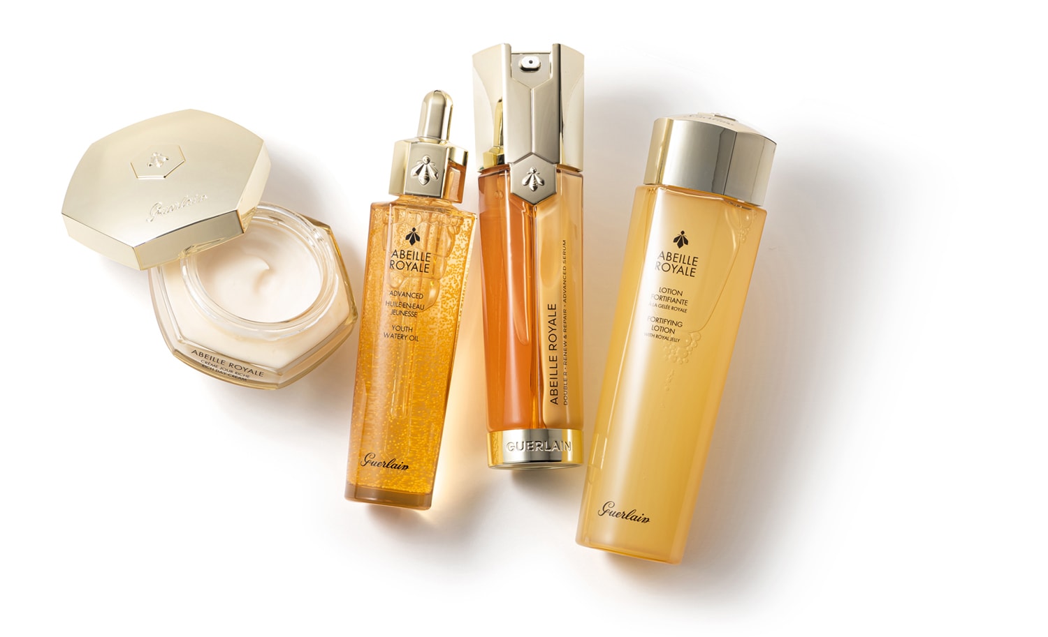ゲラン独自のロイヤルゼリーを配合。ミツバチの恵みと科学の力で、ふっくらとしたハリと潤いに満ちた肌へと導くスキンケアライン。アベイユ ロイヤル フォーティファイング ローション 150ml ¥9,790、同 アドバンスト ダブルR セロム 50ml ¥27,390、同 アドバンスト ウォータリー オイル 50ml ¥18,810、同 アベイユ ロイヤル クリーム ¥ 19,470(すべてゲランお客様窓口)