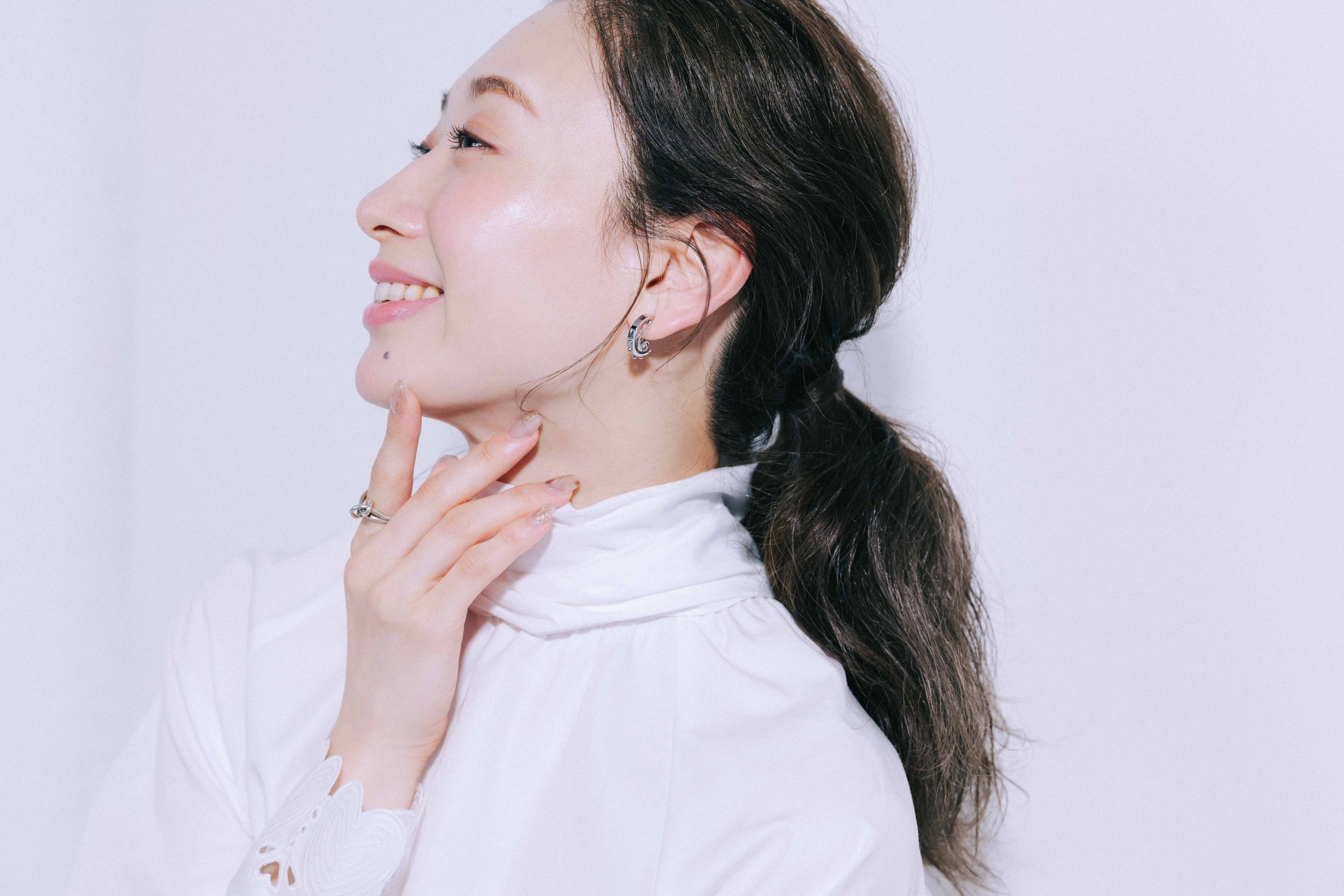 【衣装】ブラウス¥41,800(ANAYI)イヤリング¥6,600<ルミゴーシェ>リング¥8,690<Kaméemon>(ともにロードス)