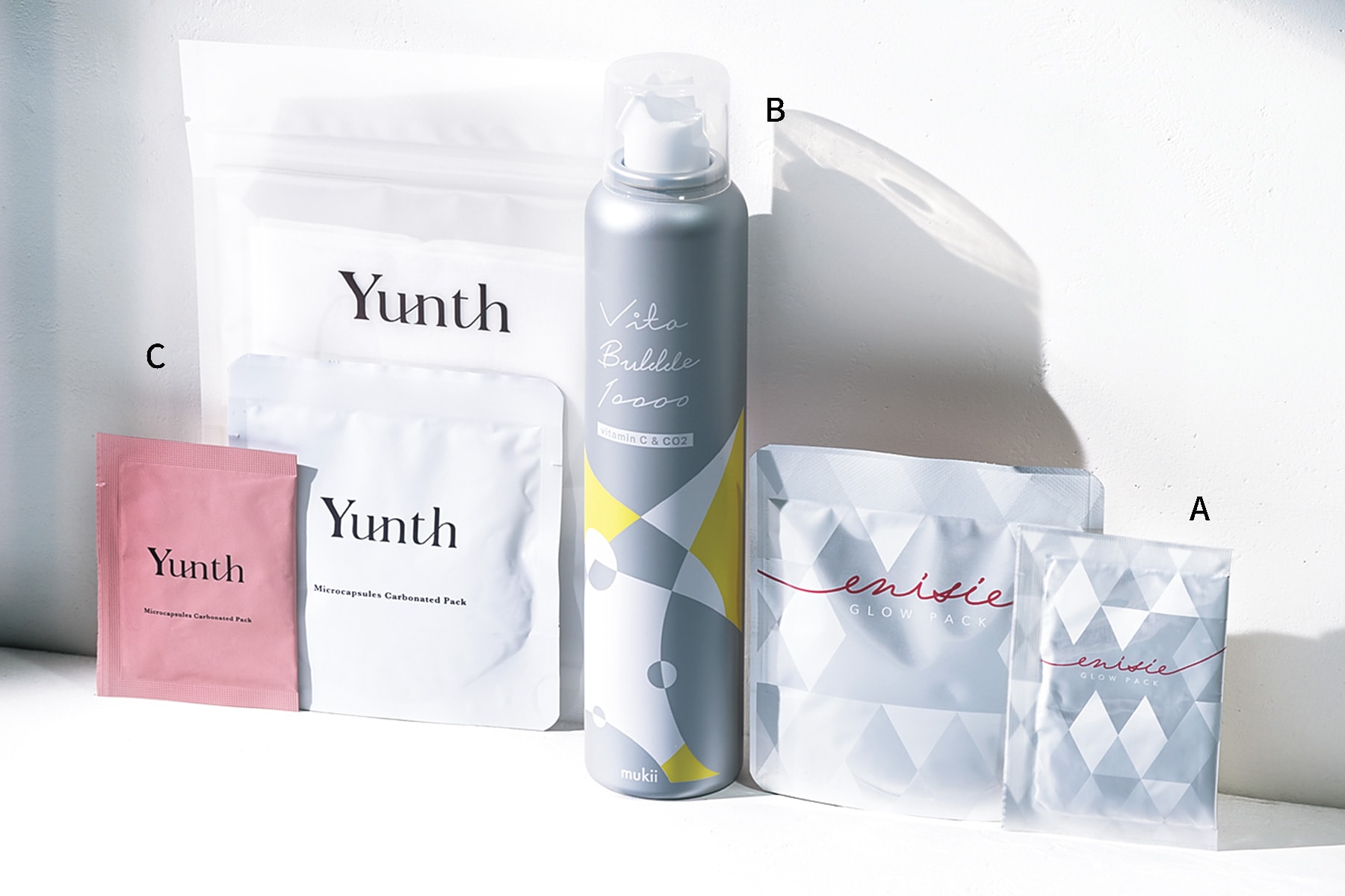 A.〈enisie〉固まるジェルマスクタイプの高濃度炭酸ガスパック。美容好きにファンが多く、朝に使うと一日中透明感が持続!大野さんも愛用。エニシーグローパック10回分[サロン専売品]¥19,800(RHYTHM)B.〈mukii〉缶からプシューッと出したらすぐに塗れるタイプの炭酸パックなので、忙しい朝でも5分ほどで手軽にケアできます。ビタミンC誘導体配合で、さらに透明感をサポート!大野さんが開発したアイテム。mukii ビタバブル10000¥4,290(サウルス)C.〈Yunth〉マイクロカプセル化したNMNやヒト幹細胞などの美容成分が入った炭酸パック。ジェル+マスクで固めて20~30分ほど置いてから剥がします。マイクロカプセル炭酸パック3回分¥4,389(Yunth)