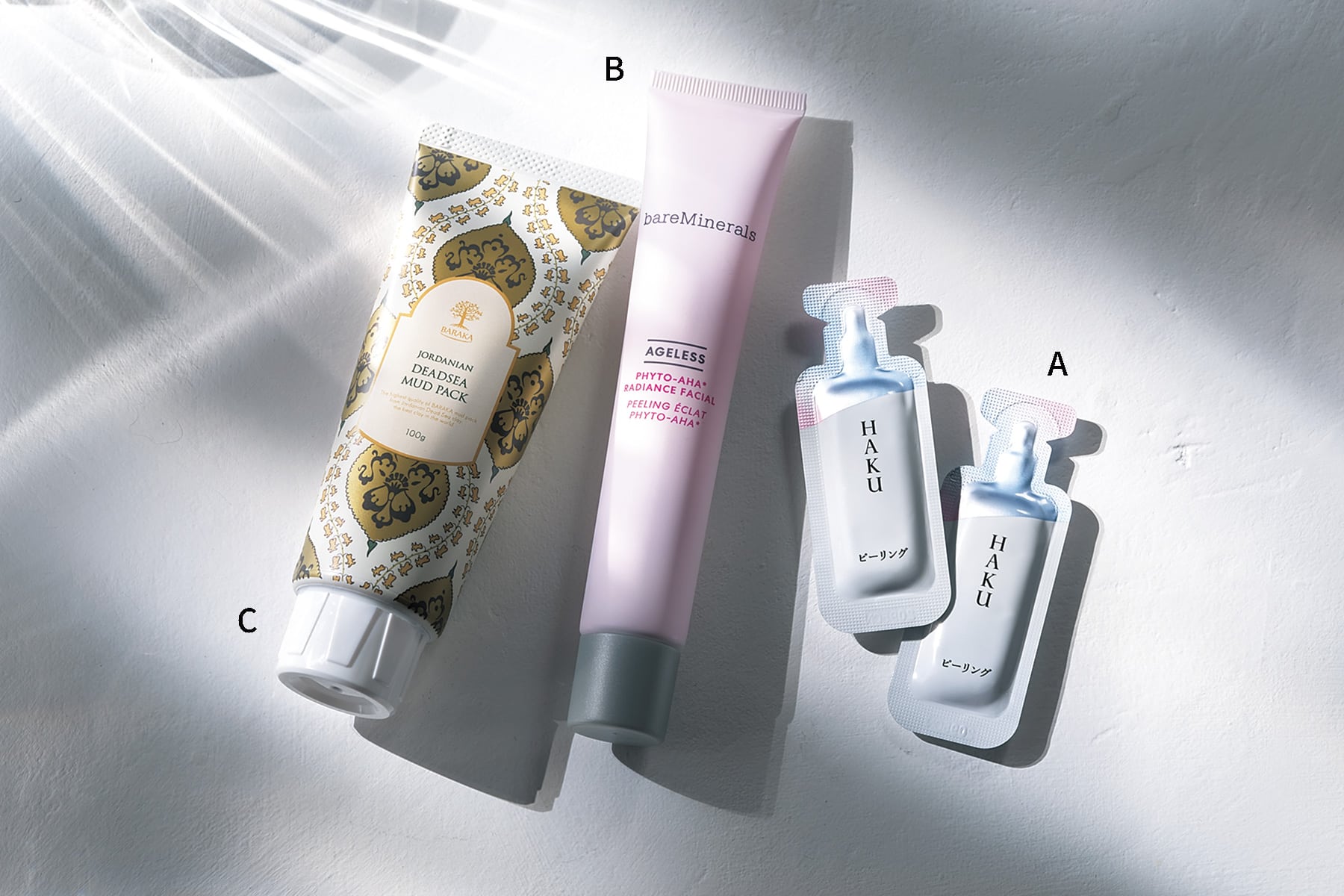 「角質は放っておいても落ちていくので、ケアのしすぎはNG。角質ケアの後は、しっかり保湿を!」A.〈HAKU〉溜まったメラニンを含んだ余分な角質を、マイルドに溶かして洗い流すピーリングマスク。HAKUピーリング3g 4包¥4,400(資生堂)※数量限定発売中 B.〈bareMinerals〉ヴィーガン処方の洗い流すピーリングマスク。植物由来のフィトAHAで低刺激だから安心。AGL フィト ラディアンス フェイシャル50㎖¥7,150(ベアミネラル)C.〈BARAKA〉余分な角質や汚れを吸着する天然の死海の泥を配合したクレイパック。大野さんも愛用。ジョルダニアン デッドシー マッドパック100g¥4,950(BARAKA)