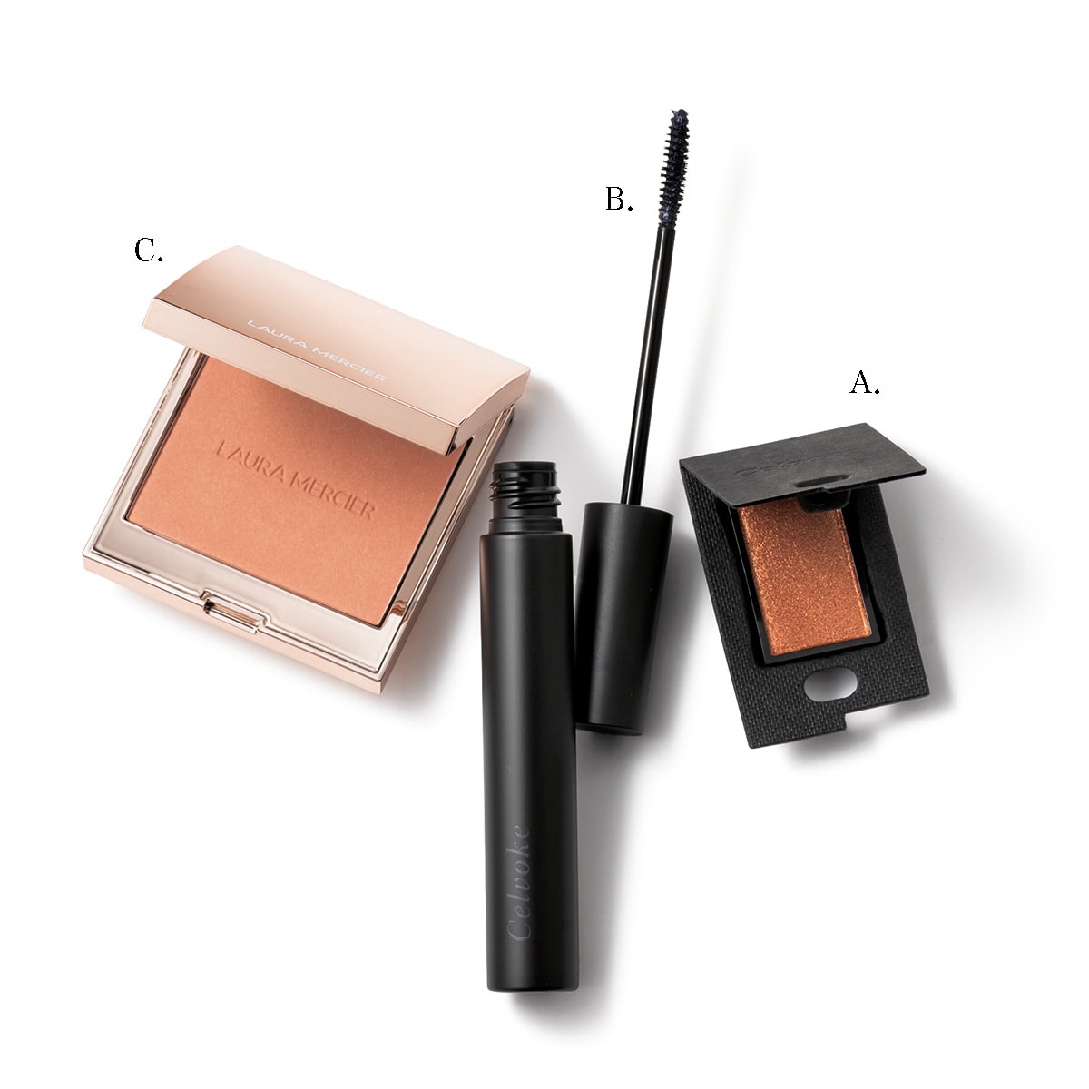 A.まろやかな血色感を足すオレンジゴールド。他のアイシャドウとも組合せやすい色みで、持ち歩きにも便利です。セルヴォーク ヴァティック アイズ 05 ¥2,200 B.ブラウンよりしっかり目力が出て、黒よりやさしい、ネイビーのマスカラ。瞳を澄んだ印象に導きます。同インラプチュア ラッシュ01 ¥4,180(ともにセルヴォーク) C.ピーチオレンジが健康的。微細なローズグロウパール入りで、満ち足りたツヤとうるおいを与えます。ローラ メルシエ ブラッシュ カラーインフュージョンR2 ¥3,850(ローラ メルシエ ジャパン)