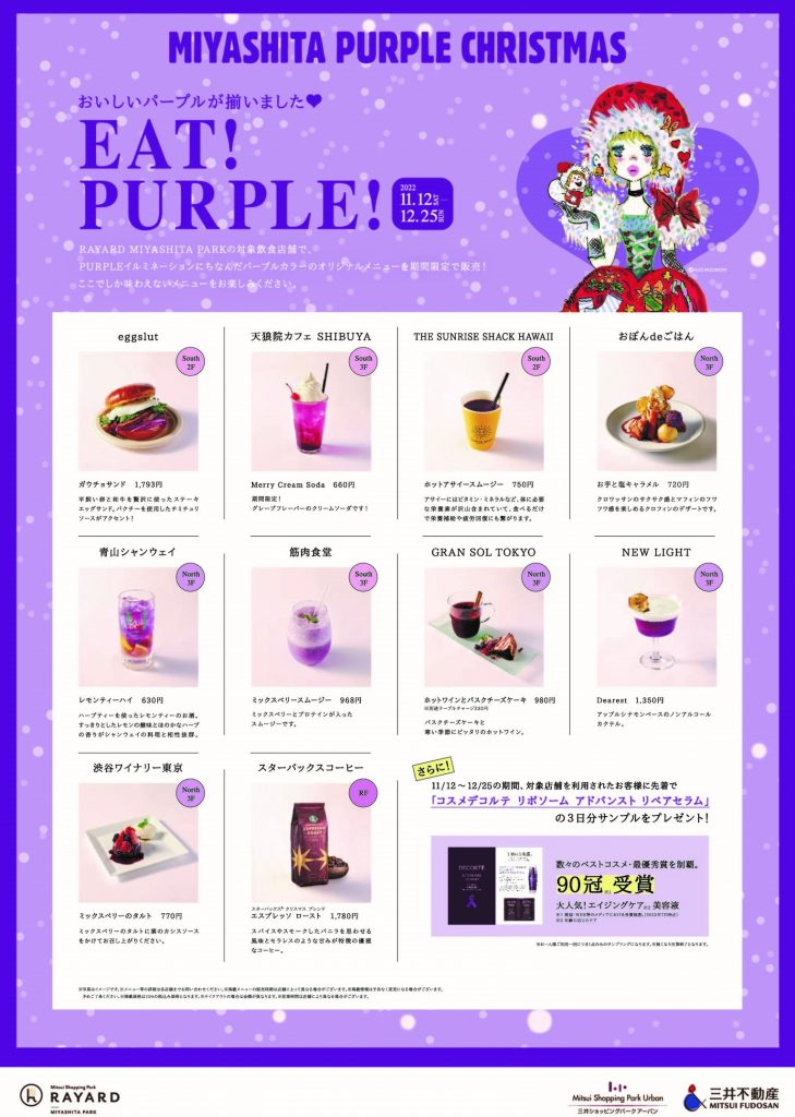 RAYARDMIYASHITA PARKの対象飲食店舗にて、テーマカラーであるパープルにちなんだ限定メニューを販売。期間中、コラボメニュー対象店舗を利用すると、先着で「リポソーム アドバンスト リペアセラム」3日間分のサンプル(※なくなり次第終了)がもらえます。この機会に人気の美容液を試してみて!