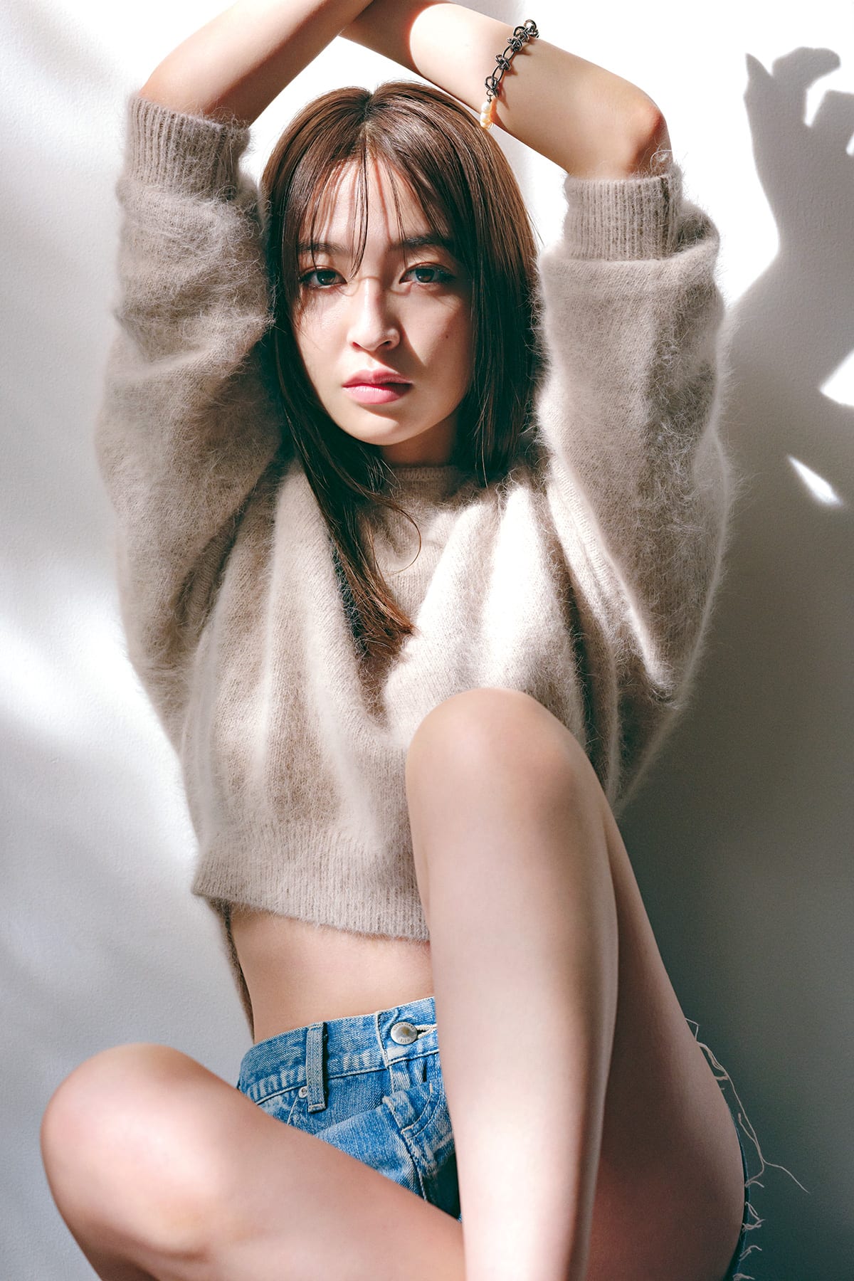 ニット¥17,820(マイストラーダ/マイストラーダ プレスルーム)ショートパンツ¥22,000(NORMA JEANS BLU)ブレスレット¥7,700(アビステ)