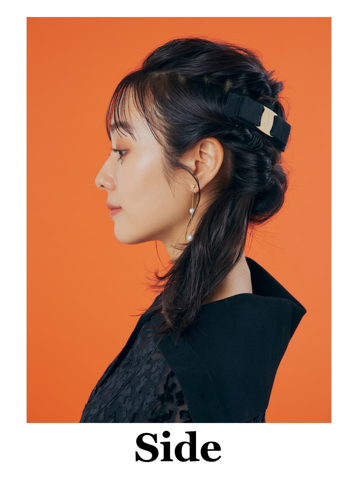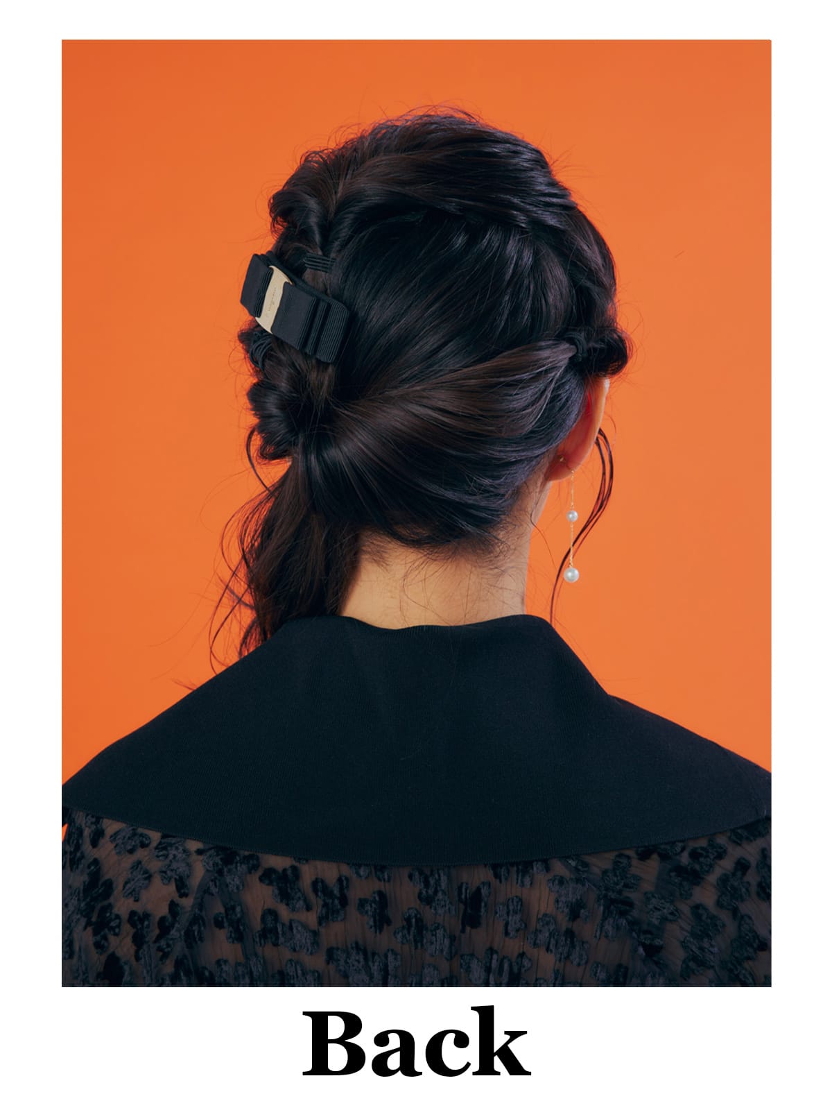 正面はもちろん、全方位ぬかりなくキマるこのヘアアレンジ。アレンジが華やかな分、ドレスはオールブラックをチョイスして引き算を。動くたびに揺れるプリーツと柄入りのシースルー生地が、ドレスアップ感を盛り上げます。