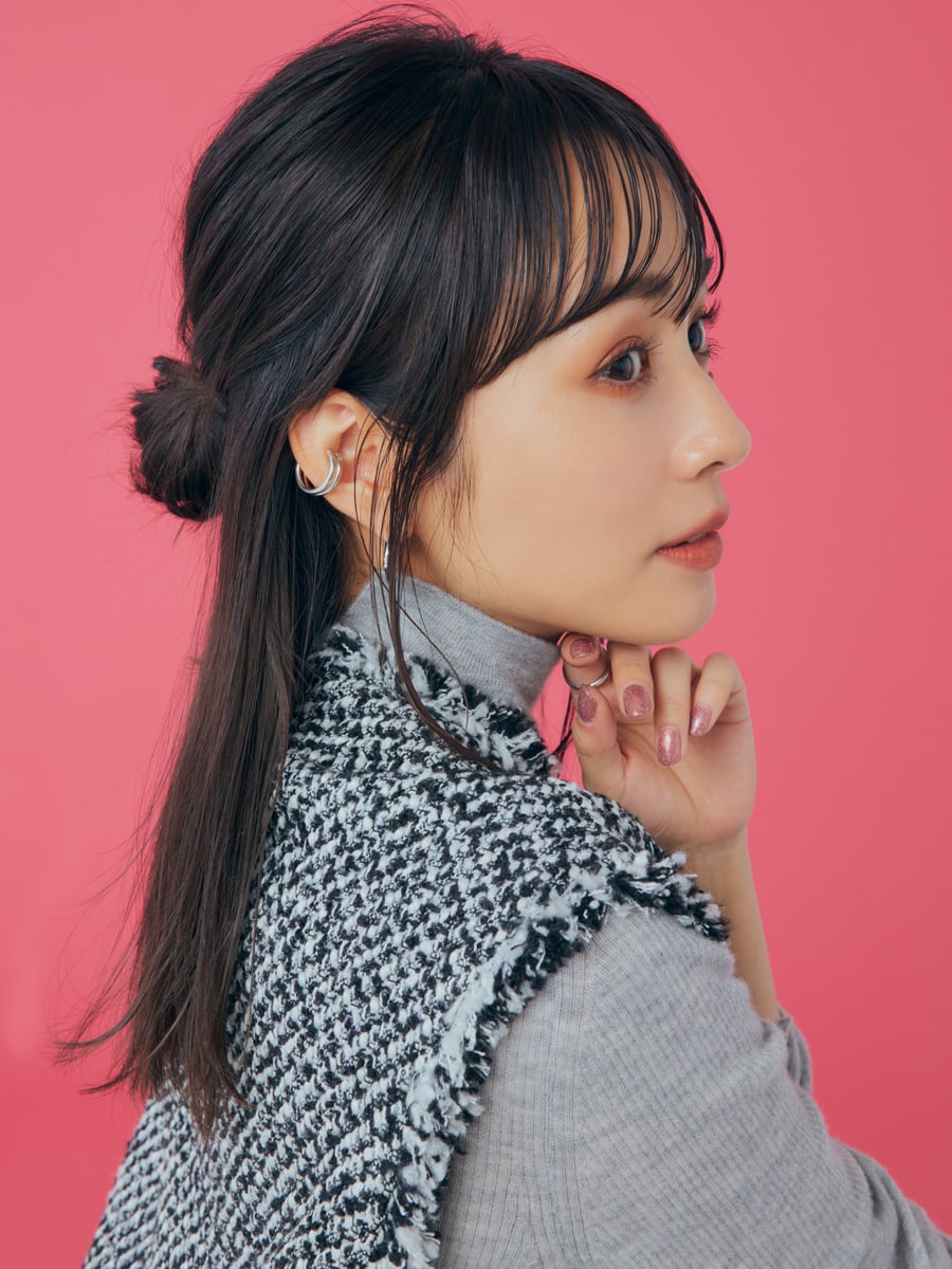 一年に数回しか会えない親戚へのご挨拶の日は、上品で大人らしい印象を重視したい。ジレでトレンドを取り入れつつ、全体をグレートーンでまとめてシックなコーデに仕上げるのが正解。パールアクセを添えて華やかさと清潔感を。一年の始まりにふさわしいきちんと感ある着こなしだからこそ、簡単なのに凝って見えるヘアアレンジでさらなるレベルアップを!