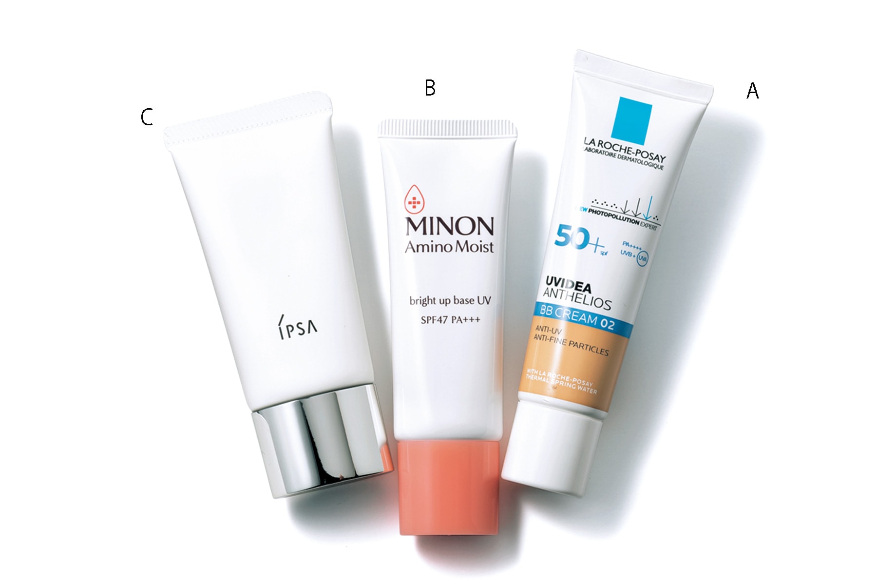 A.シミやくすみをカバーするBBクリーム。シワの原因になるロングUVAもカット。UVイデア XL プロテクションBB 02〈SPF50+/PA++++〉30㎖ ¥3,960(ラ ロッシュ ポゼ) B.敏感肌向けブランドならではの低刺激設計。ピンク系で自然に肌色補整。ミノンアミノモイスト ブライトアップベース UV〈SPF47/PA+++〉25g ¥1,760※編集部調べ(第一三共ヘルスケア) C.バリア機能低下の要因となりうる、紫外線や花粉、チリやホコリの付着をブロック。プロテクターセンシティブe〈SPF30/PA+++〉30g ¥3,850(イプサ)※3/7発売