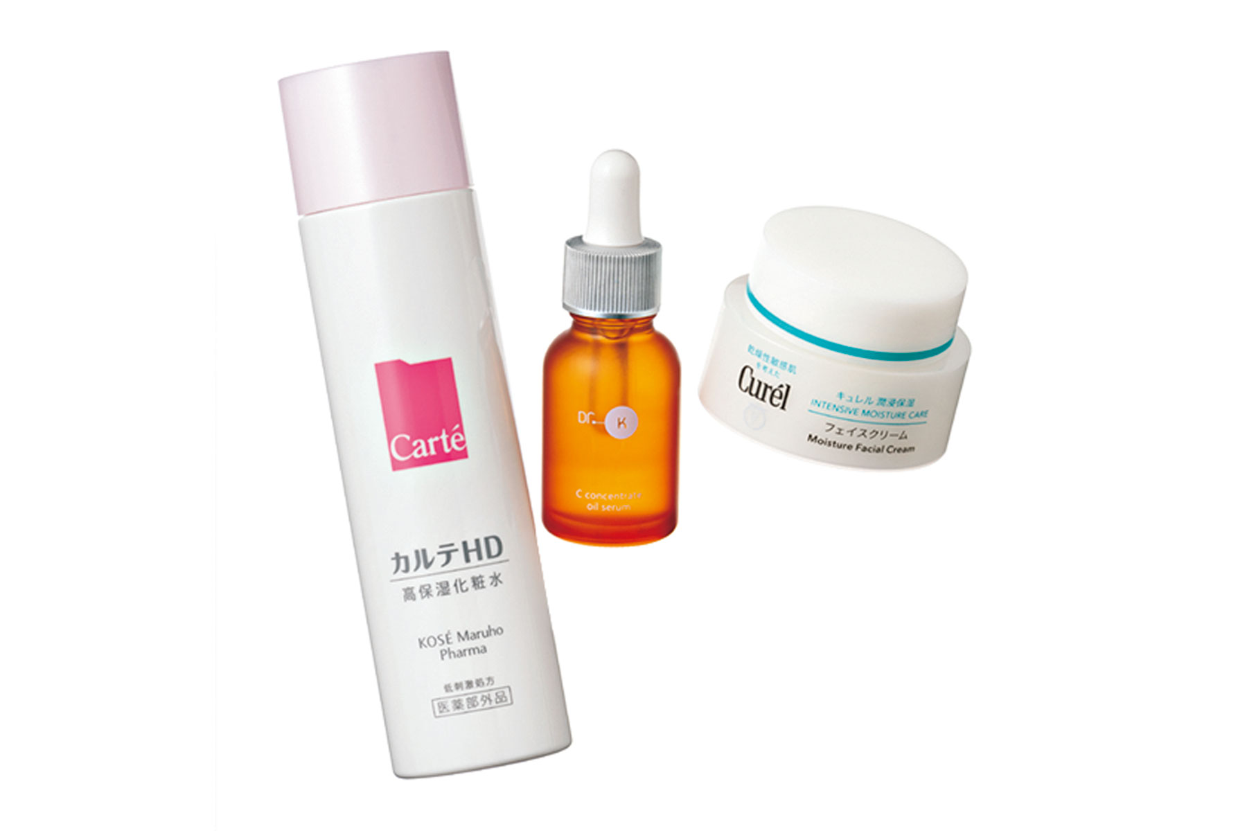 [右から]キュレル潤浸保湿フェイスクリーム40g[医薬部外品]¥2,530[編集部調べ](花王)、ドクターケイ Cコンセントレートオイルセラム 20㎖¥5,940(ドクターケイ)、カルテHD モイスチュア ローション 150㎖[医薬部外品]¥1,980(コーセーマルホファーマ)