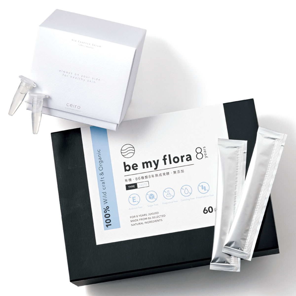 [上から]肌細胞を活性化するNMNを配合。無菌室で作った完全無添加の美容液。セイロバイオエッセンス 14bottles¥8,800(THWELL)、86種類の原材料を8年熟成した酵素ペースト。be my flora 8年熟成酵素 60包¥19,500(REBEAUTY)