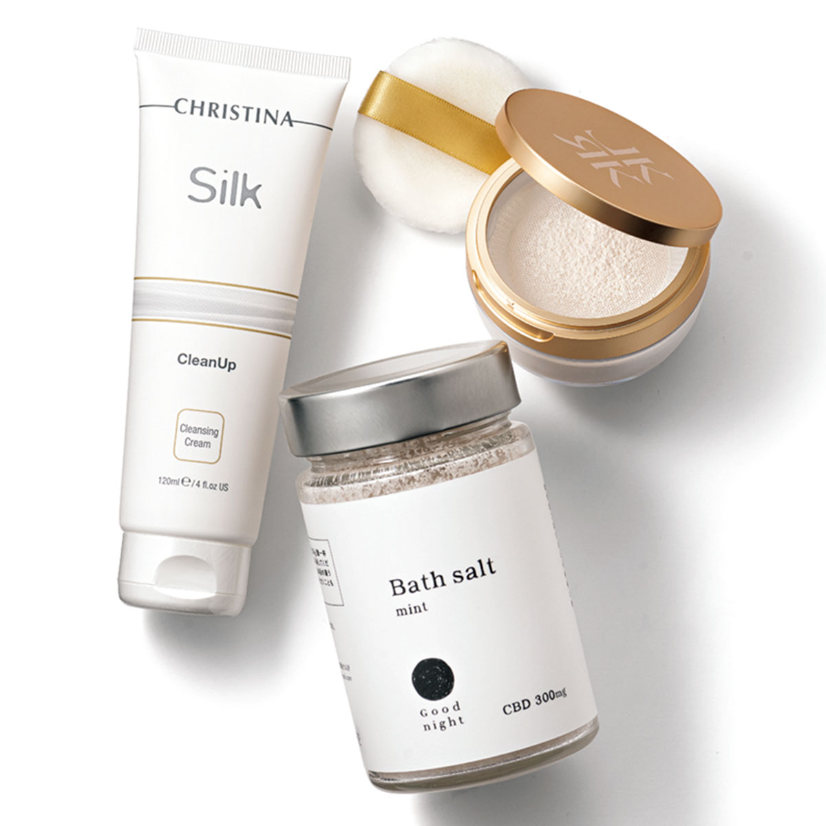[右から]レカルカ イルミネイトパウダー シルキーパール¥6,600(レカルカ)、Good night CBD バスソルト ラベンダー&ゼラニウム 250g CBD300mg¥3,960(Good night)、シルク クリーンアップクレンジングクリーム 120㎖¥6,050(クリスティーナジャパン)