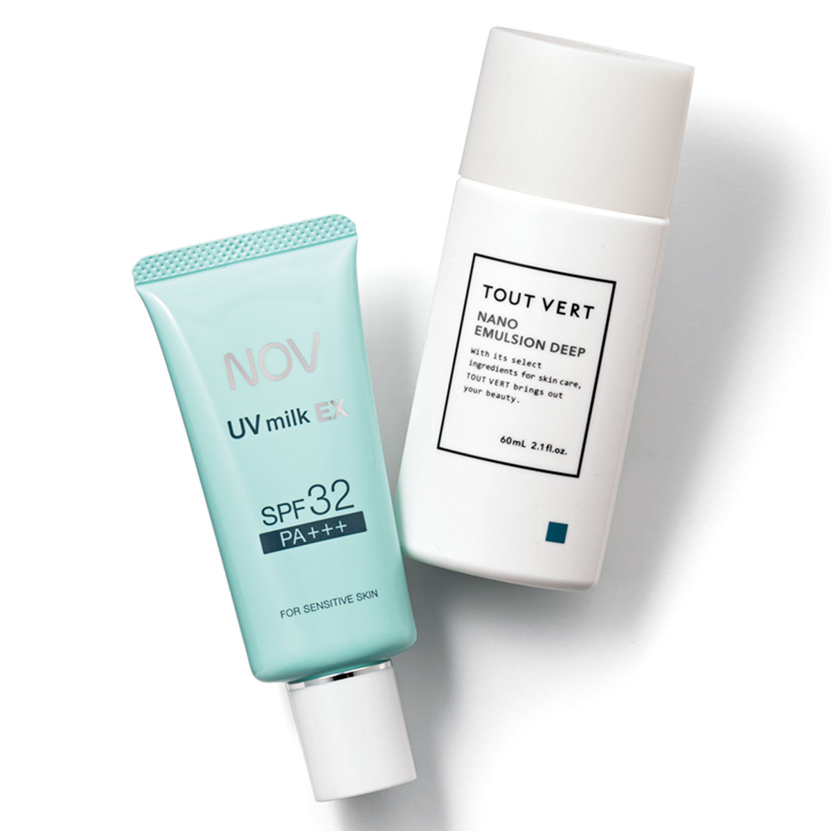 [右から]8種のセラミドを12%以上高配合。これ1本で済ますときも。トゥヴェール ナノエマルジョン ディープ 60㎖¥3,060(トゥヴェール)、お湯オフなので肌負担が軽く、肌なじみも◎。ノブ UVミルク EX SPF32 PA+++¥2,200(常盤薬品工業)