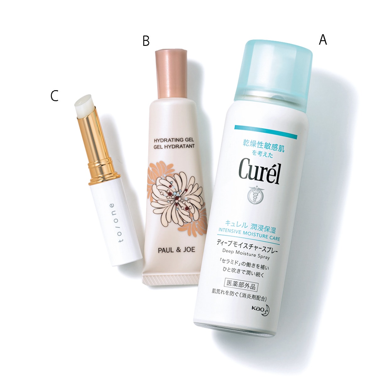 A.「セラミド」機能成分が角層まで浸透。消炎剤によって肌荒れも防ぐ!キュレル ディープモイスチャースプレー[医薬部外品]60g ¥990※編集部調べ(花王) B.メークの上から使っても崩れない、化粧直しセラム。ハイドレーティング ジェル 20㎖ ¥3,300(ポール&ジョーボーテ) C.「ビタミンC誘導体」を配合したバーム状美容液。目元や頰などにもピンポイントで保湿が可能。トーン フェイス トリートメント スティック2g ¥3,190(トーン)
