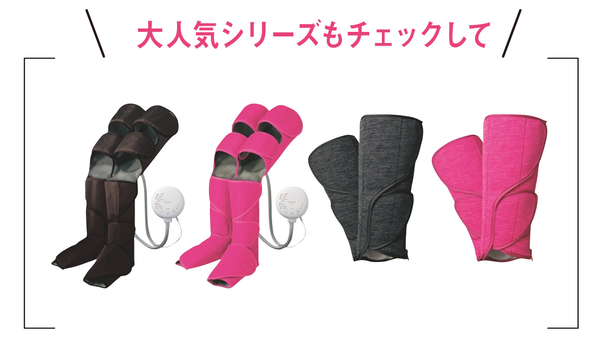 太ももまで脚全体のタイプも。【左】エアーマッサージャー レッグリフレ EW-RA98 -T(ダークブラウン) -RP(ルージュピンク) 【右】エアーマッサージャー コードレス レッグリフレ EW-RA38 -K(ブラック) -P(ピンク)すべてオープン価格(パナソニック)