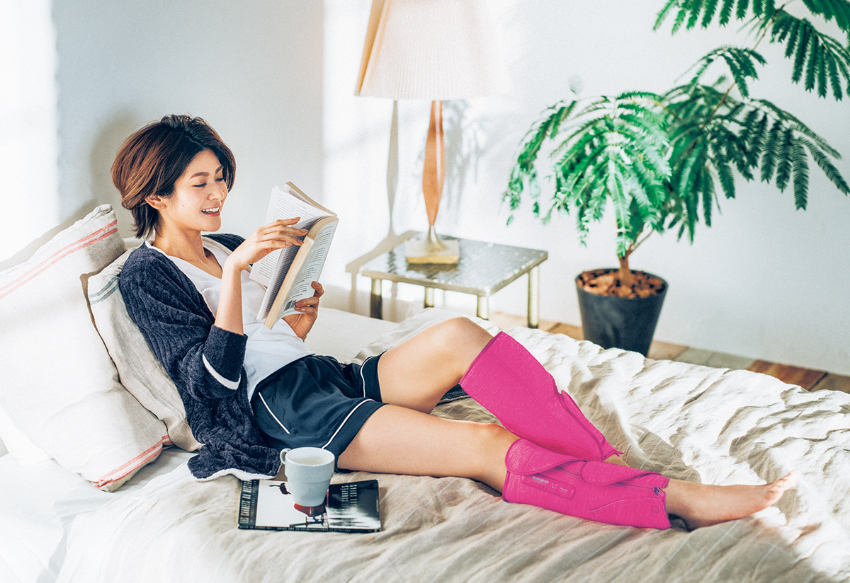 仕事柄、脚を酷使することも多いモデルさん。毎日のケアは手軽に続けられるものが欲しいところ。コードレスレッグリフレなら、いつでもどこでも、気軽に〝ながら〟マッサージが可能。翌日まで疲れを残しません。