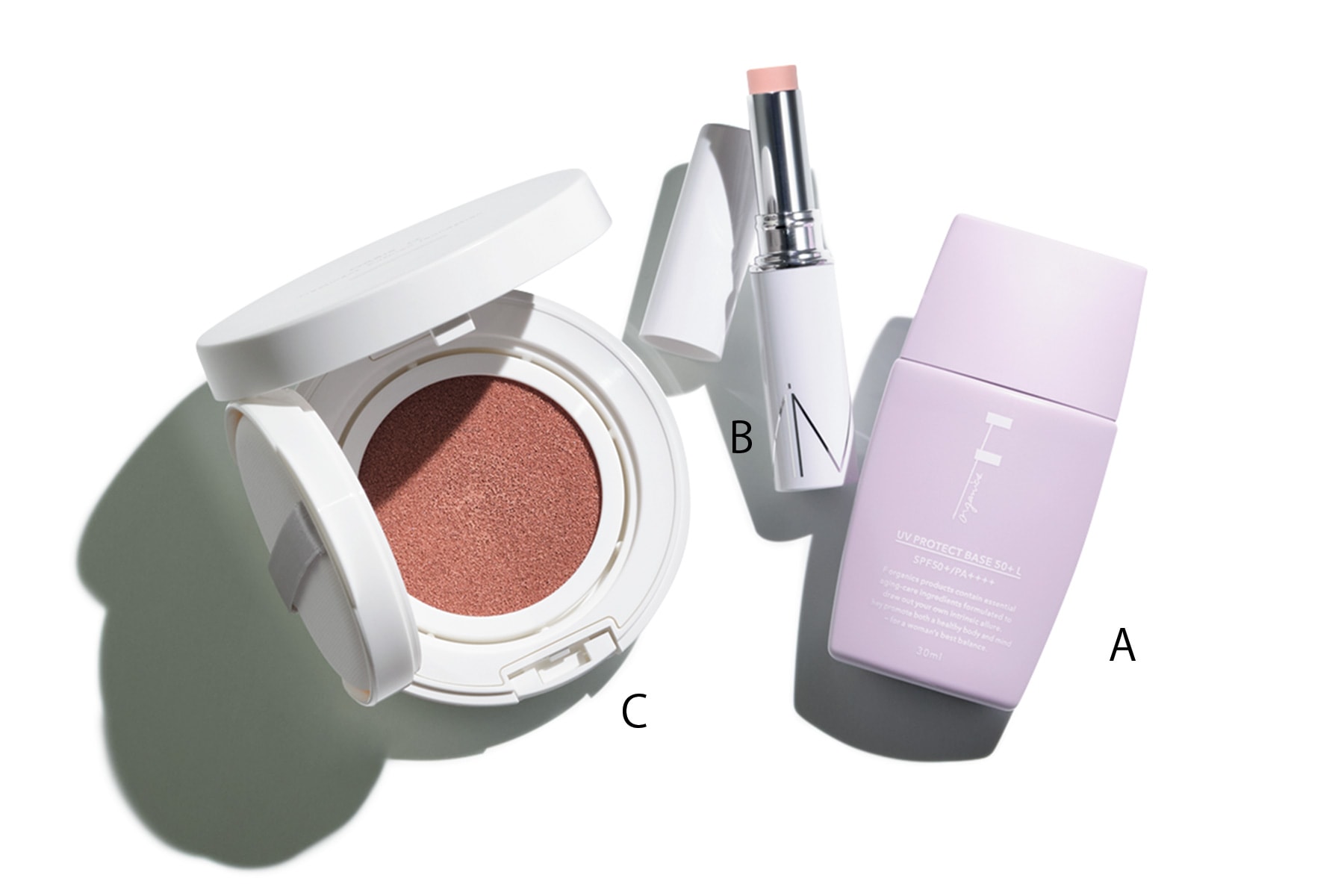 【A】ラベンダーピンクが肌を明るく見せて、透明感UP。高SPF値で紫外線やブルーライトをしっかりカット。エッフェオーガニック UVプロテクトベース50プラスL〈SPF50+/PA++++〉30㎖ ¥3,080(エッフェオーガニック)※限定品、3/23発売予定【B】カラーコントロール機能を追加した、美白×UVケアを叶える薬用美白マルチスティック。シミへの集中アプローチが可能。MiMCメラノエスケープショットCC[医薬部外品]〈SPF28/PA++〉¥4,070(MIMC)※3/22発売【C】肌が呼吸しているように軽やか。酸化しやすい油分を使用せず、長時間くすみにくい。オルビスユー トリートメントクッションファンデーション〈SPF30/PA+++〉全4色 12g ¥3,410(オルビス)※3/22発売