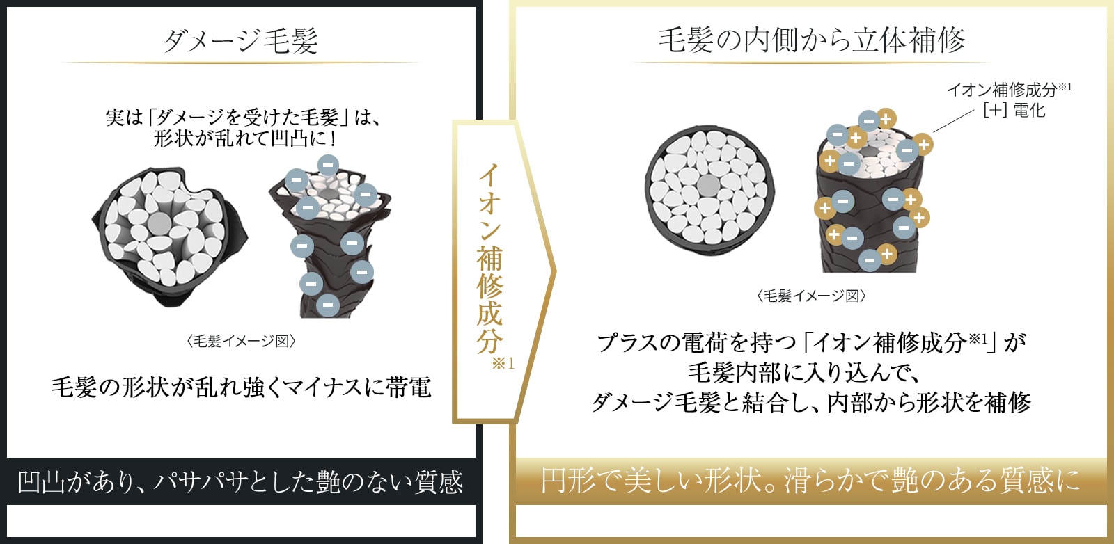 髪1本1本を内側から立体的に補修していくのが、「イオン補修成分※1」の画期的なポイント。プラスの電荷を持つ成分が髪の内側に入り込み、マイナスに帯電したダメージ毛と結合することで形状を補修していきます。内部から形状を補修したことで髪が円形に整い、光を正反射できる艶髪に。それも平面的な艶ではなく、立体感や動きを感じる艶!