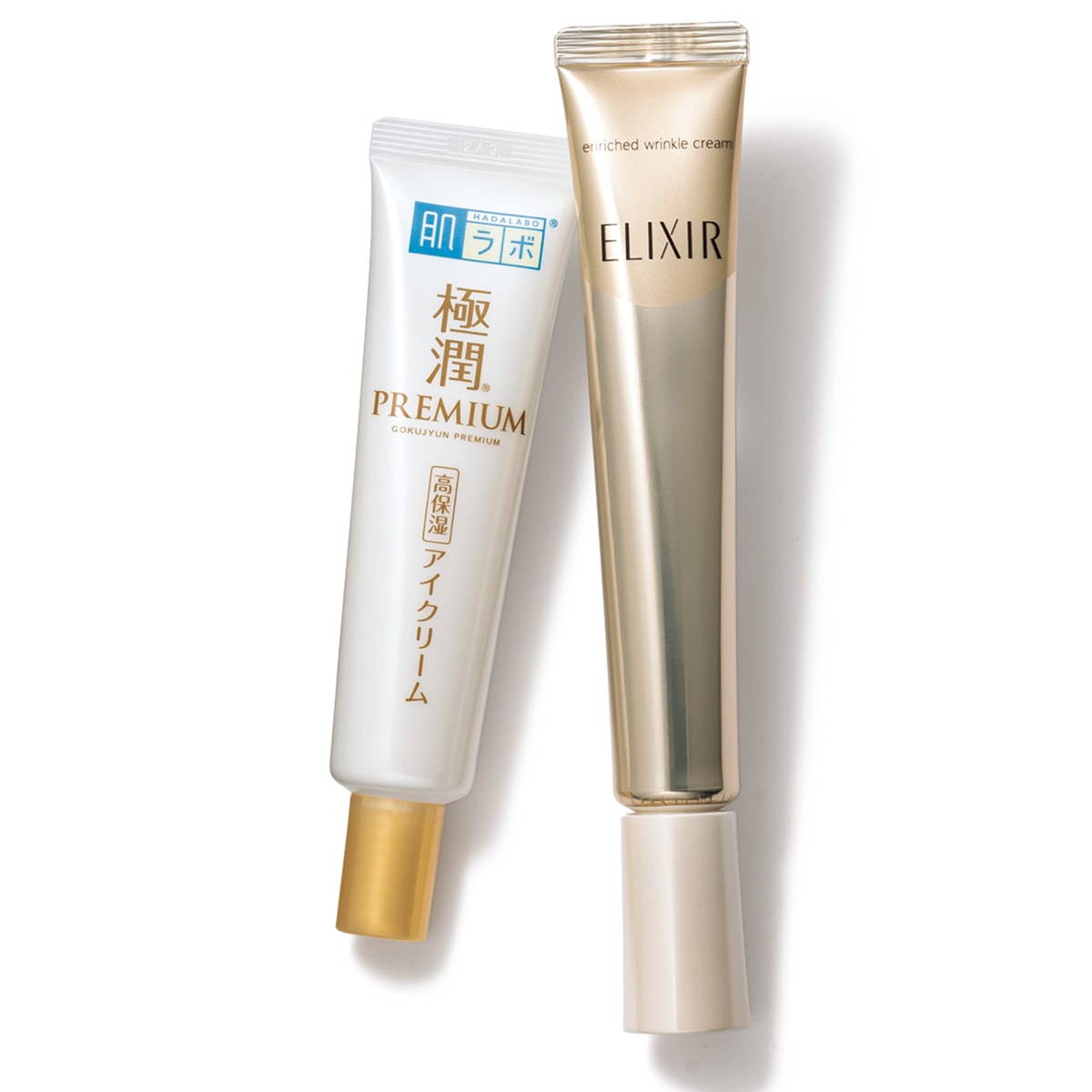 左から、ヒアルロン酸が肌内部まで浸透。肌ラボⓇ 極潤プレミアムⓇ ヒアルロン アイクリーム 20g¥990〈編集部調べ〉(ロート製薬)シワを改善する純粋レチノール配合。エリクシール シュペリエル エンリッチド リンクルクリーム L[医薬部外品]22g¥8,580〈編集部調べ〉(資生堂)