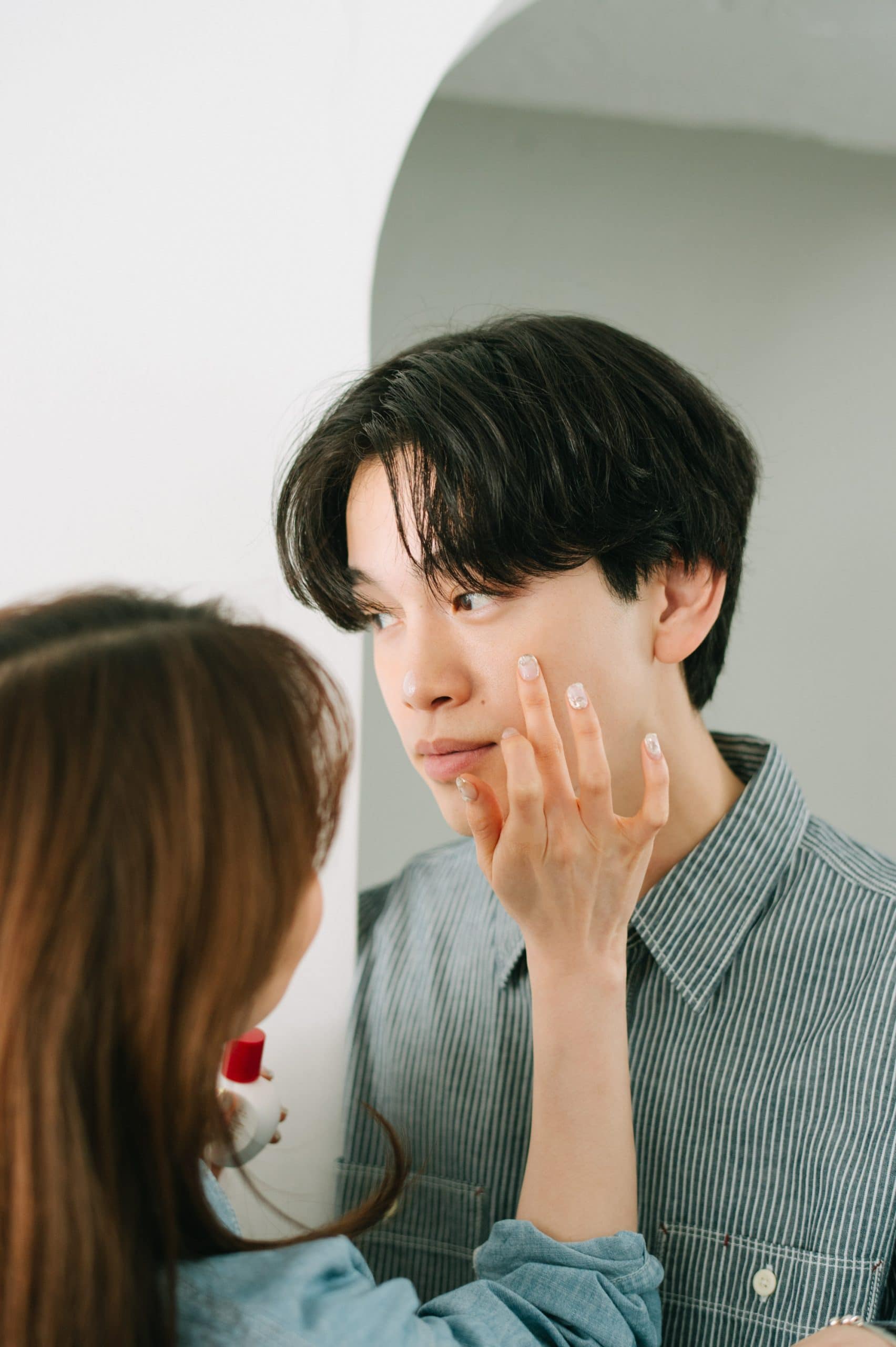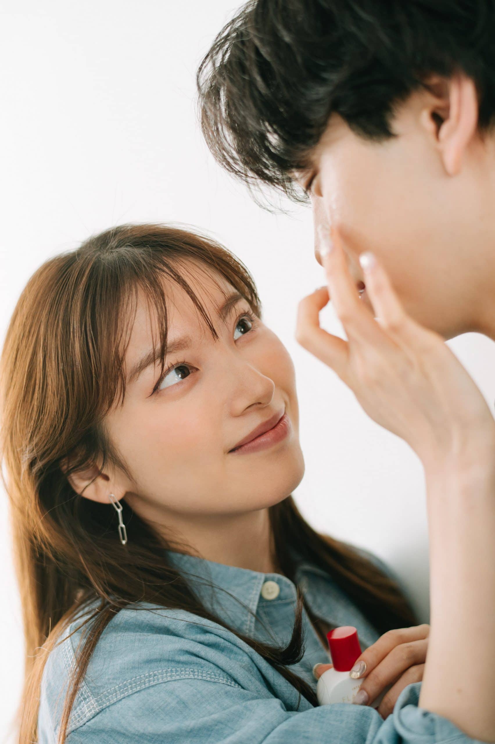 シェアするUVケアアイテムは、色づきなしなのに美肌見えを叶えるアイテムがおすすめ。自分はベースメイクに、彼はUV対策に。一緒にあれこれお試しするのもシェアコスメを楽しむコツ。