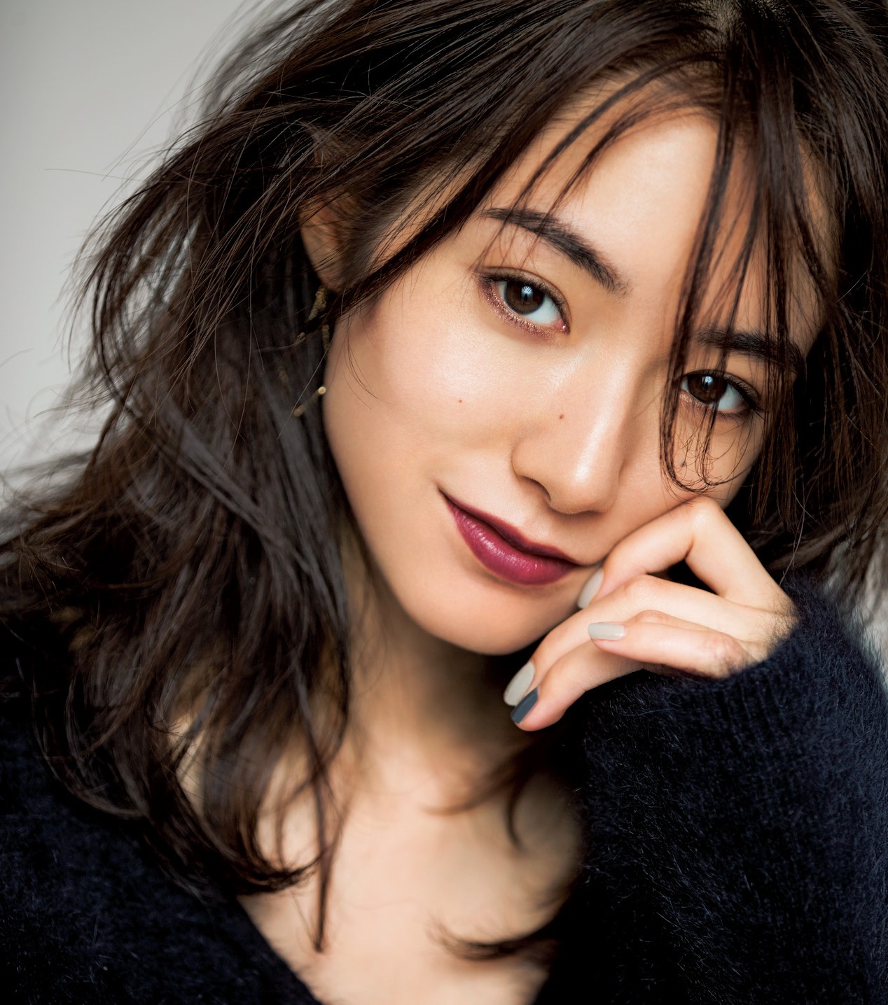 マットな濃いカシス色の口紅が今っぽさを後押し。口紅に主張があるのでアイメークは下まぶたのキワに濃い茶のアイシャドウを塗るのみで。