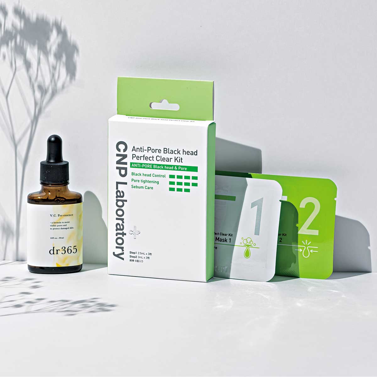 【右】「角栓が黒ずんだり、硬くなったときのスペシャルケアアイテム。黒ずみが溶けて、柔らかくなった角栓も浮き出てくるので、いちご鼻を解消できます」CNP ブラックヘッド クリアキッド 3回分 ¥980(銀座ステファニー化粧品)