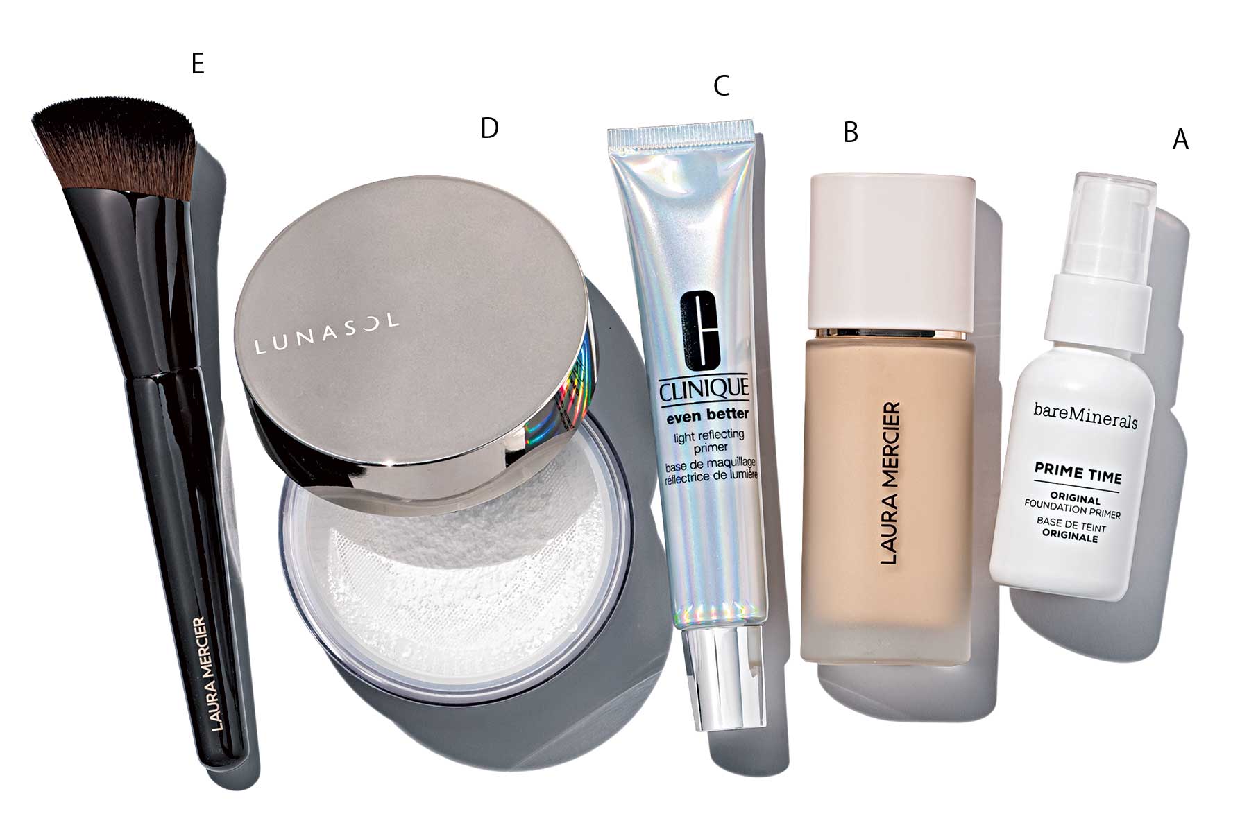A.「さらっとして、メークが崩れにくくなる名品。毛穴や小じわなどの細かいノイズも、フィルターをかけたようにキレイに」プライム タイム 30㎖ ¥4,620(ベアミネラル)B.「優しく叩き込んでいくと、ファンデがとろけてお肌がぷるんとして毛穴レスに! なのに表面はさらっとしているんです。汗をかいても、トントンと指で叩くとなじむのでメーク直しも簡単」ローラ メルシエ フローレス ウェイトレス パーフェクティング ファンデーション 全5色 30㎖ ¥6,820(ローラ メルシエ ジャパン)※5/31発売 C.「濡れ感のツヤだけでなく、ダイヤモンドのように発光する輝きもあって、肌がパンッと元気に見える!」イーブン ベター ライト リフレクト プライマー 30㎖ ¥4,950(クリニーク) D.「皮脂吸着パウダーで一日崩れにくいのに、肌に触れるとしっとり感もあって絶妙なバランス」ルナソル スムースクリアパウダー 01 ¥5,500(カネボウ化粧品) E.「繊細な毛先とカッティングで、鼻周りや口角などの細かい部分にもフィット。塗りムラを防ぎます」ローラ メルシエ リアル フローレス ファンデーション ブラシ¥6,600(ローラ メルシエ ジャパン)※5/31発売