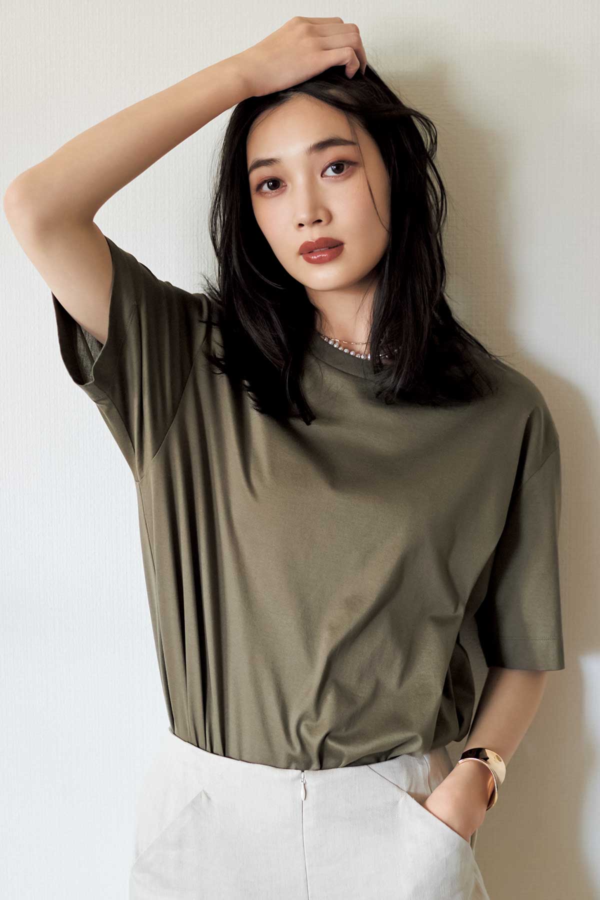 Tシャツ¥9,680(スローン)パンツ¥48,100(ルーム エイト ブラック/オットデザイン)パールネックレス¥14,850バングル¥11,550〈ともにエイチアッシュ〉ネックレス¥63,800〈アナプノエ〉(すべてフォーティーン ショールーム)