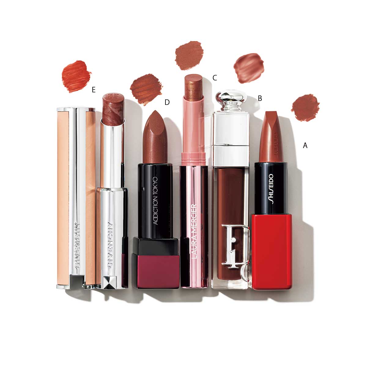 A.(モデル着用カラー)唇にピタッとフィットする〝ストレッチフレックステクノロジー〟を採用。発色感としっとり感を長時間キープ。SHISEIDO テクノサテン ジェル リップスティック 405¥3,960(SHISEIDO)B.唇を自然にボリュームアップしてくれるプランプグロス。ディオール アディクト リップ マキシマイザー 020¥4,620(パルファン・クリスチャン・ディオール)C.体温でちゅるんと溶けるようになじむつけ心地。クリアで鮮やかな発色。ローラ メルシエ ハイバイブ リップカラー 102¥4,620(ローラ メルシエ ジャパン)D.洒落感のあるダークな色味ですが、シアーな発色なのでモードになりすぎない。アディクション ザ リップスティック シアー L 102¥3,520(アディクション ビューティ)※限定発売中 E.スキンケア成分がマーブル状に溶けこんでいるバームリップ。ほんのりと地色が透ける仕上がりに。ローズ・パーフェクト No.501¥4,620(パルファム ジバンシイ)※6/2新発売