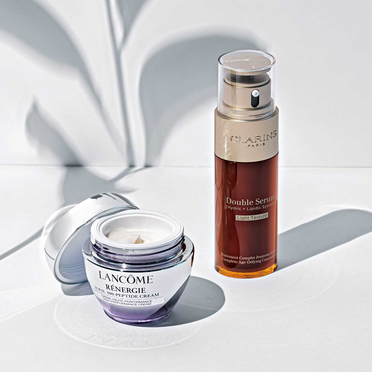【右】「名作美容液に〝ライトテクスチャー〟が登場。ベタつかないのでオイリー肌さんはもちろん、汗や皮脂が気になる夏にも使いやすいエイジングケア*美容液」ダブル セーラム ライト 50㎖ ¥16,500(クラランス)*年齢に応じたケアのこと