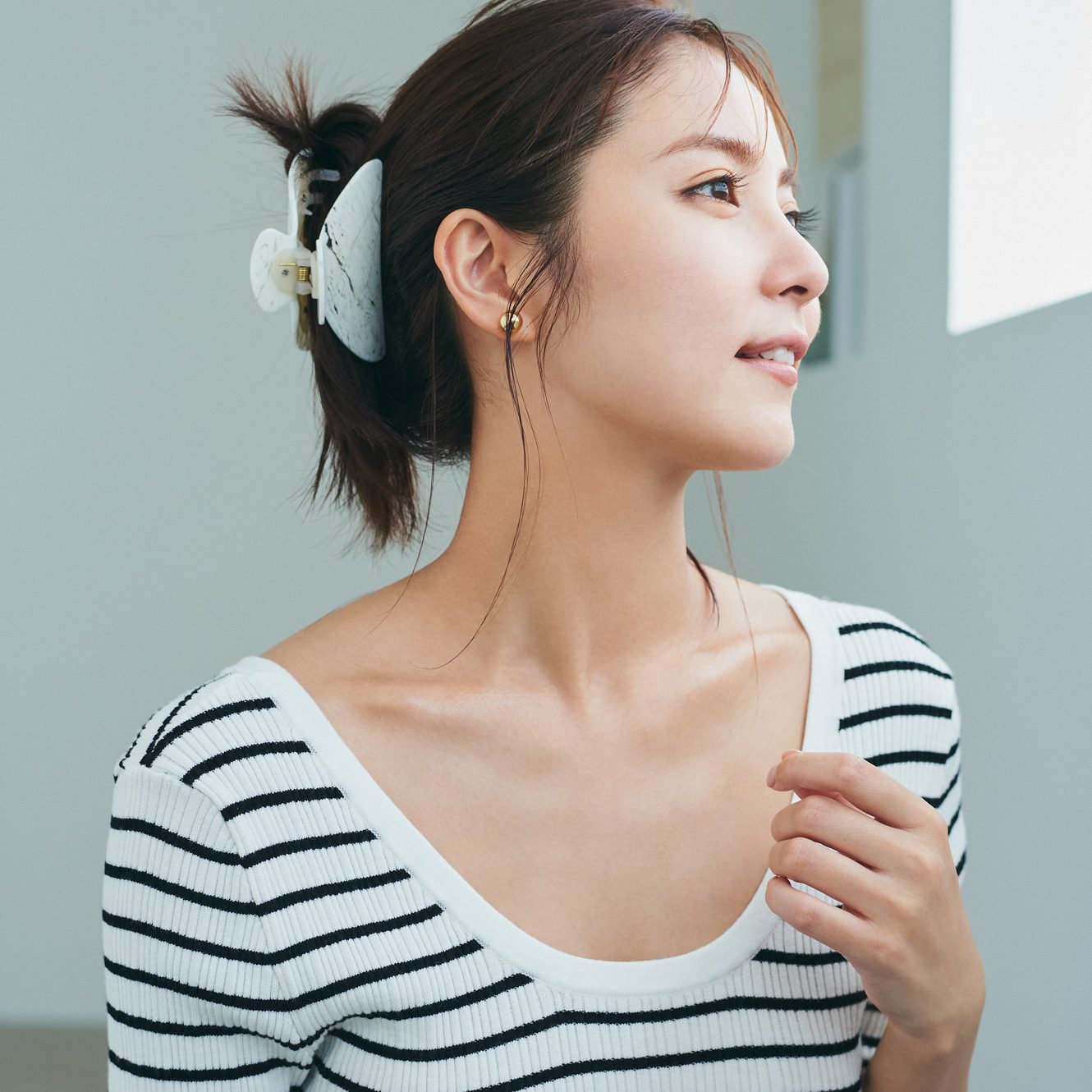 カットソー¥10,450(カデュネ/カデュネ プレスルーム)ヘアクリップ¥9,240(マシェット/ZUTTOHOLIC)ピアス¥23,100(モニス/フォーティーン ショールーム)