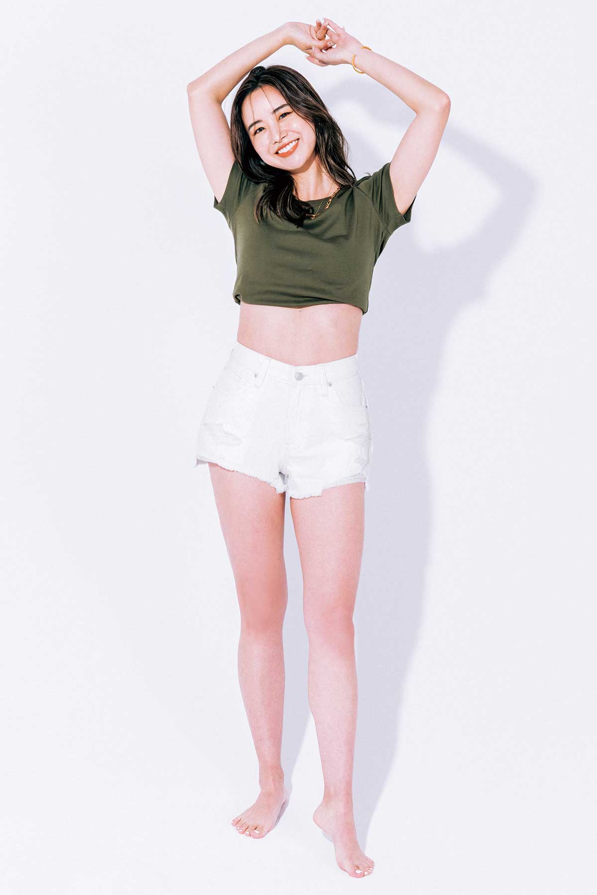 もともと自己肯定感が低かったのですが、トレーニングを始めてからそれがいい方向に変化していきました。外見から少しずつ変わっていって、自分に自信が持てるポイントが増えて。筋トレをすると食事も気をつけるし、生活習慣も整って、一日の流れがすごく健康的になるんです。そうすると必然的にマインドもポジティブに!フィットネストレーナーという仕事柄ずっと体型には気を遣っていますが、25歳くらいからは今までつかなかった部分にお肉がつくようになって…。トレーニングと食事も大事ですが、年齢を重ねるごとに寝る前のストレッチなど日々の習慣も大切だなと実感しています。体づくりを始めた当初から「女性として強く、美しくなりたい」という気持ちはブレません。日本ではまだまだ「細い=美しい」と思われがちですが、程よく女性らしい柔らかさは残しつつ、筋肉はしっかり、締まるところは締まっている体が理想です。大好きなデニムが似合う体でいたいです!