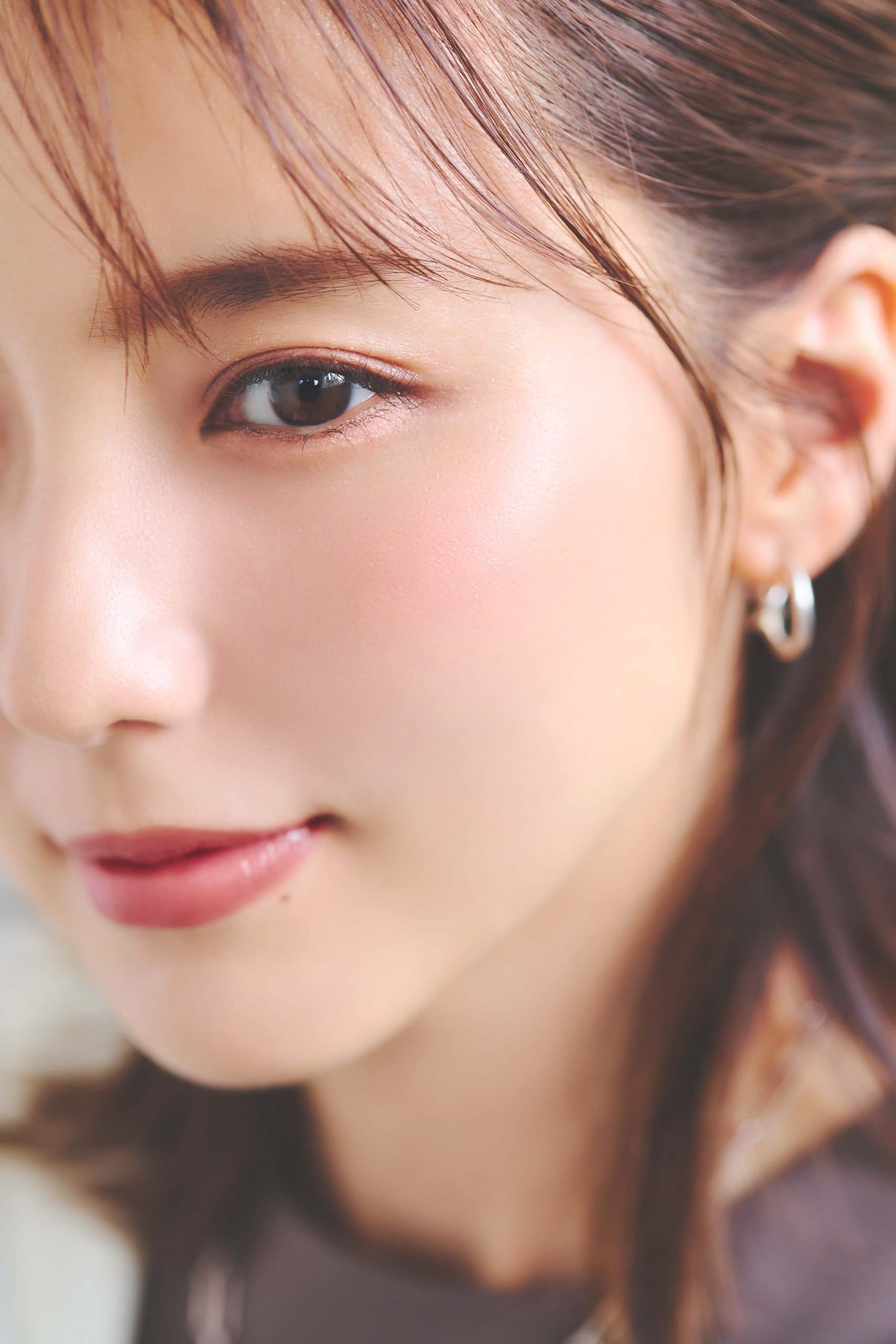 肌の透け感を残すように、頬の外から内に向けて色を伸ばす感覚でON。はじめに「NARS アフターグロー」のWANDER LUSTを横長の楕円形で頬に広めに仕込み、その下半分に「DOLCE VITA」を重ねます。どちらも可愛すぎないカラーなので、深みのある大人のチークに。