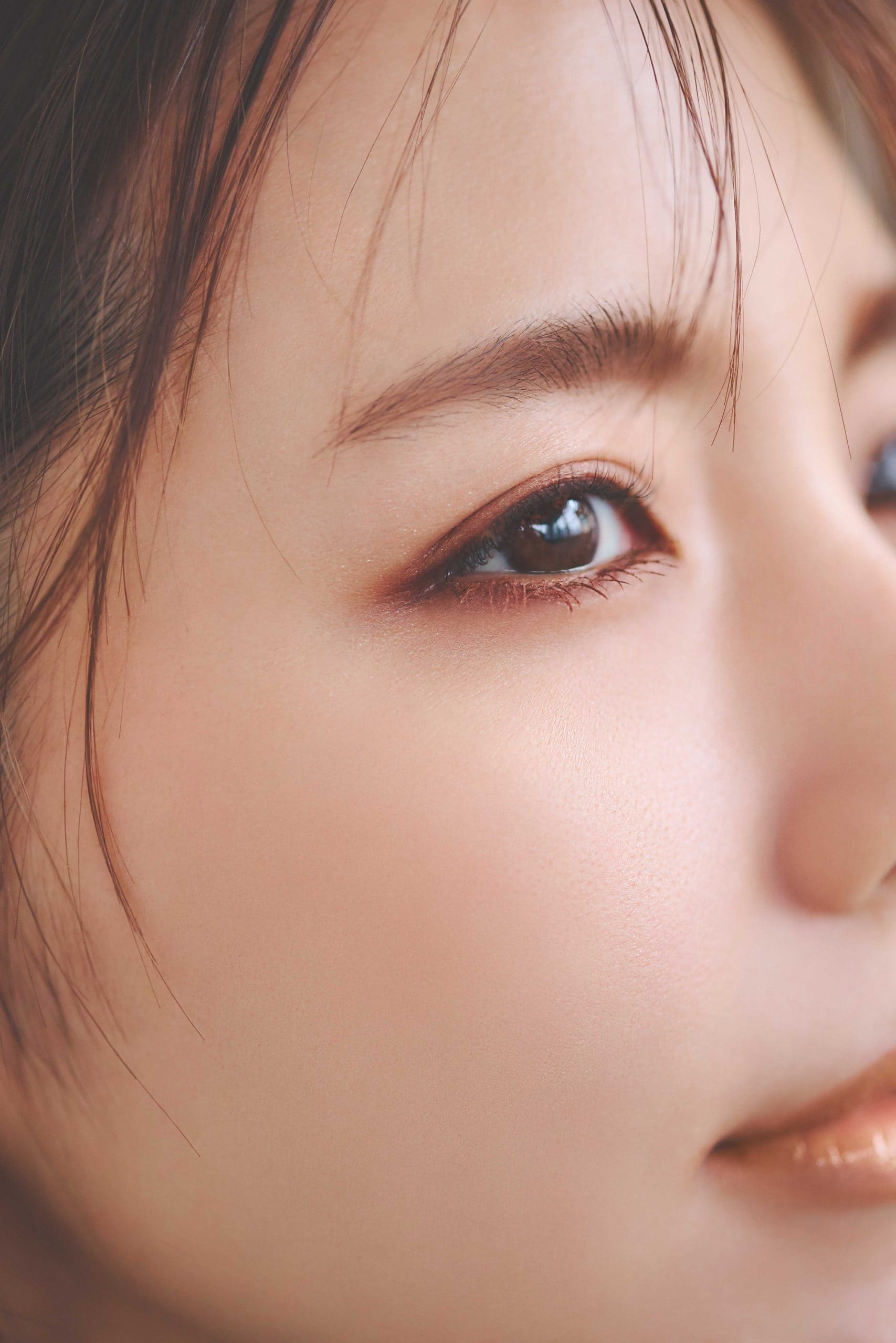 目元はゴールドブラウンのみで囲み目風に。上まぶたのキワと、下まぶたの目尻にカラーペンシルを伸ばし、ぼかすだけ。まつげに塗って残ったマスカラは、アイブロウに足してニュアンス調整を。まつげとペンシルだけで目元に立体感が備わります。