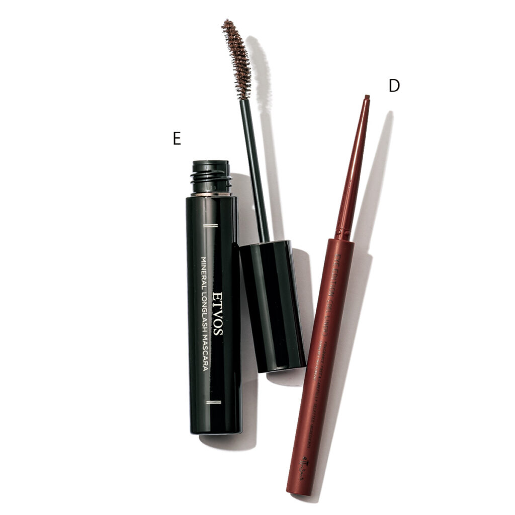 E.植物由来のカールロック剤配合で、キュッと上がったまつ毛に。ミネラルロングラッシュマスカラ チョコレートブラウン¥2,970(エトヴォス)※8/2新発売(ともにモデル使用コスメ)