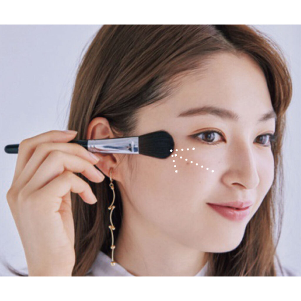 そのままのブラシで、黒目の下からこめかみに向かい自然な濃淡グラデになるよう意識してなじませます。下に広げすぎずに、小鼻ラインよりも上におさめること。