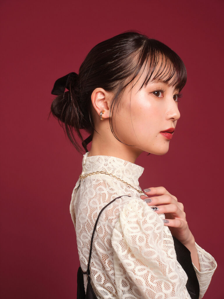 【衣装】ブラウス¥7,990(ギャップ)ワンピース¥29,700(styling/)イヤリング¥140,800ネックレス¥253,000(ともにウノアエレ/ウノアエレ ジャパン)バングル¥38,500(ハイク)