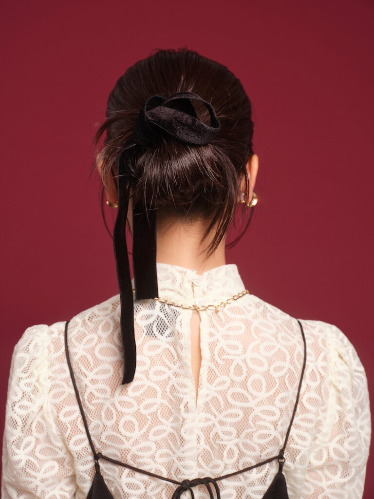 パッと目を惹く大柄なホワイトレース。クラシカルな雰囲気のパーティコーデには、ヘアもどこかレトロなポイントをつくるとバランスよし! そこで活用したのが黒のベロアのリボン。リボンの揺れとシニヨンの丸みのコンビネーションで、凝った印象と甘さが漂います。