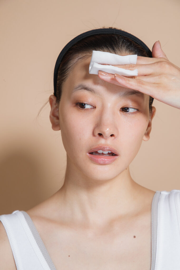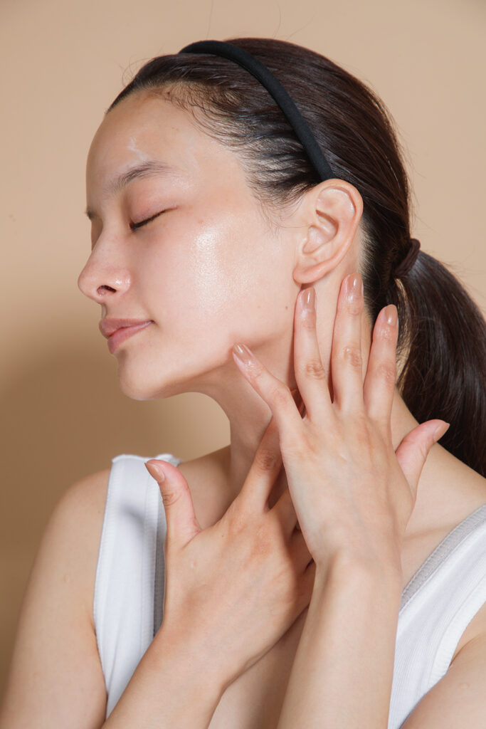 太陽の似合う、晴れやかな印象を作る肌作りのポイントは、自然なツヤがあることはもちろん、こめかみやフェイスラインのゆるみがないことが大切なポイントに。顔の輪郭が変わるスキンケアをほどこして。