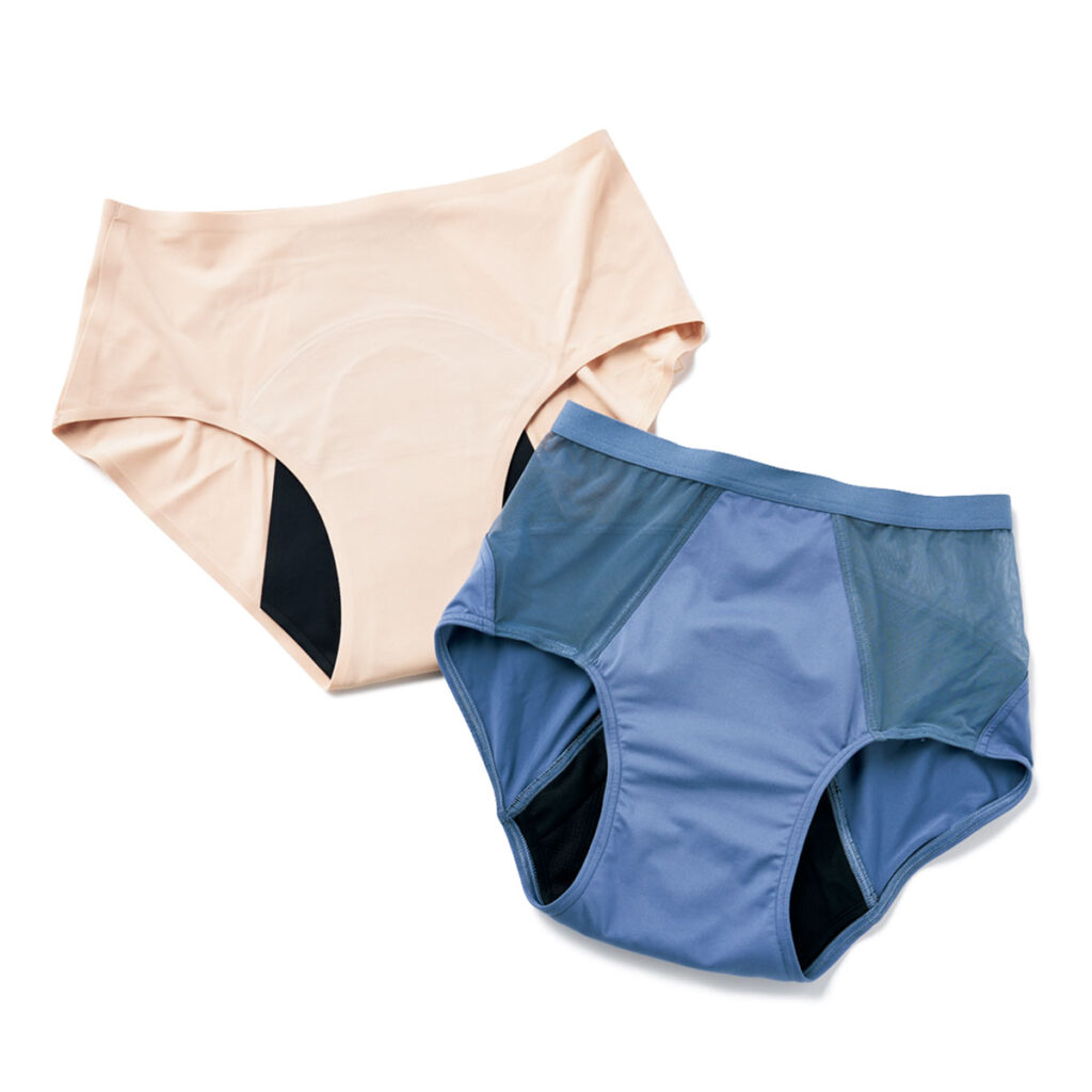 (左)はき心地が心配なら、ユニクロがおすすめ。エアリズム使用で肌触りはサラッと快適。エアリズム吸水サニタリーショーツ(スタンダード・ジャストウエスト)吸水量:30~ 40㎖/ベージュ〈9 色展開〉/XS~3XL¥1,990 (UNIQLO)
