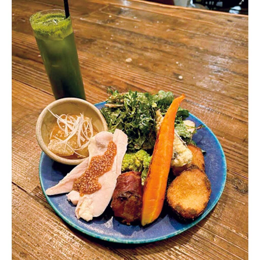 『食事に関しては夜に限らず、添加物や白砂糖、酸化した油を使った料理は避けています。写真はケールサラダと鶏ハム、里芋とごぼう、にんじん、ロマネスコのフライ。できるだけオーガニック野菜を選んでいます。』