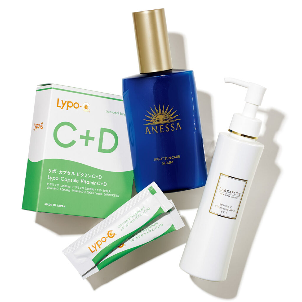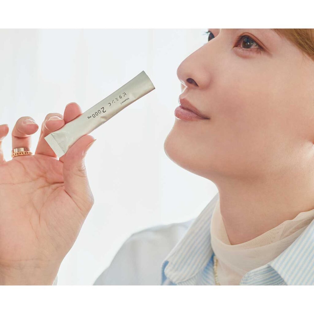 『シミやくすみの原因になるメラニン色素の生成を抑制、また抗酸化作用のあるビタミンCは不可欠。体の中に貯めておくことが難しく、吸収・排出されてしまいます。だからこそ、こまめに摂取することが重要。僕は一日に2000mgを5回に分けて摂るようにしています。帰宅したら、ビタミンCを摂ることを習慣に!』