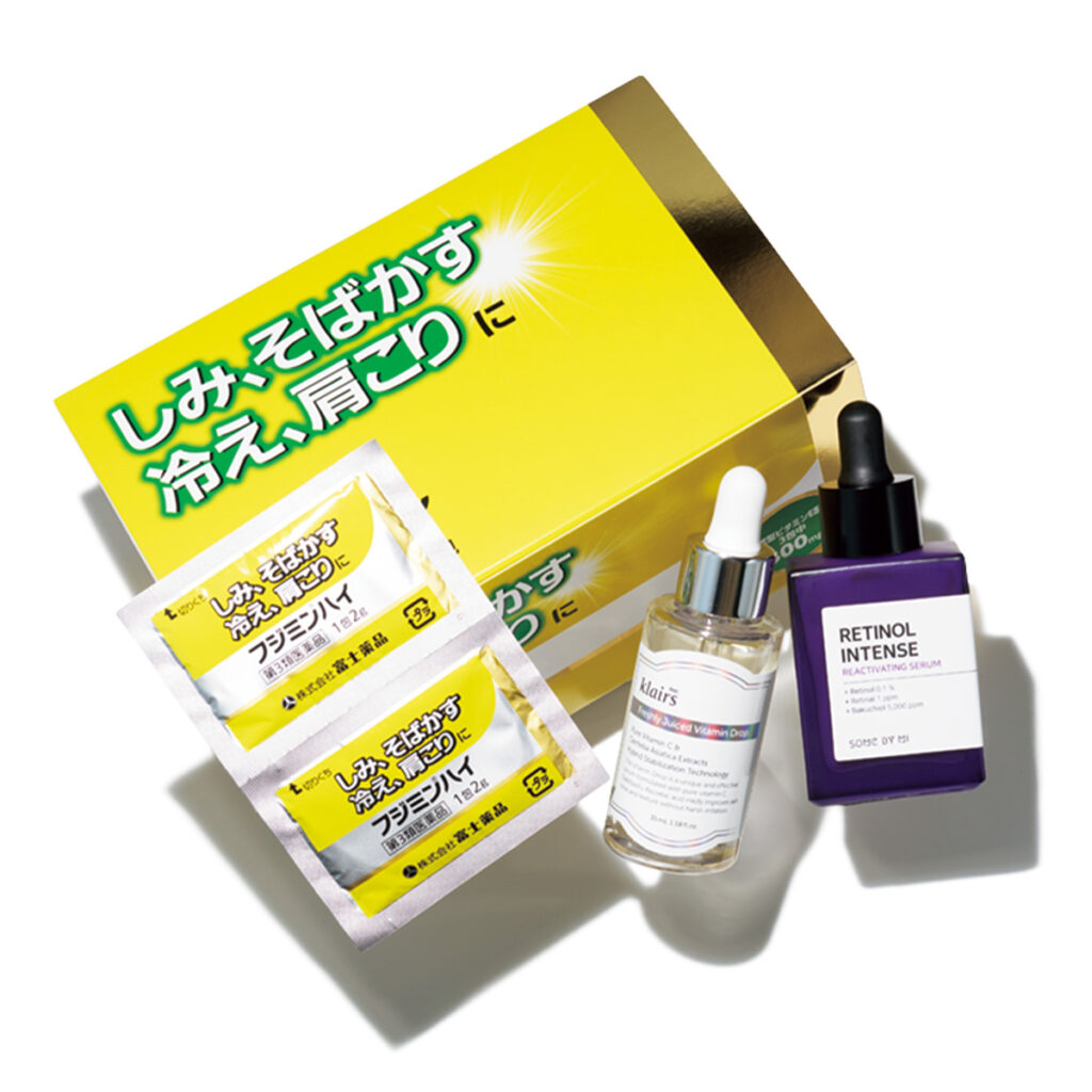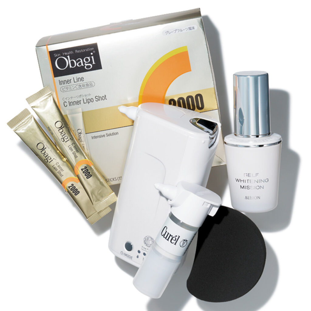 [右から]「こんなにトーンアップを感じた美容液は初めて!角層と色素へWの美白アプローチ」アルビオン セルフホワイトニング ミッション[医薬部外品]40㎖ ¥8,800(アルビオン) 「極薄ヴェールを纏いながら眠ることで、角層にうるおいを留めてくれます」キュレル着る角層ケア〈カートリッジ〉¥6,600 ヴェールクリエイター¥29,700※編集部調べ(ともに花王)※4月4日発売 「美味しくて続けやすい高濃縮ビタミンC。肌状態をよい状態に保つことで、美白にもつながります」オバジCインナーリポショット 62本入り ¥8,370(ロート製薬)