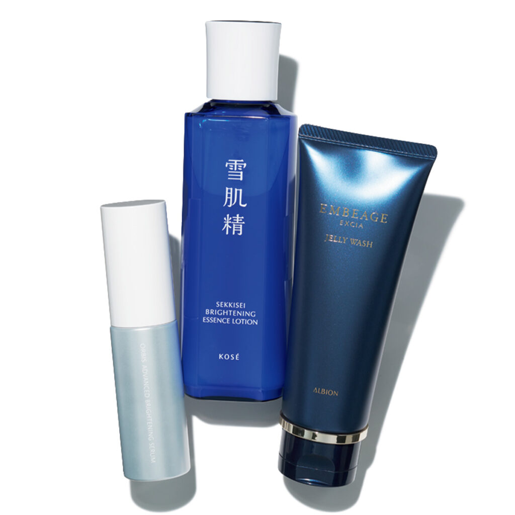 [右から]「黄ぐすみの原因である不飽和脂肪酸を、悪玉化しないように洗い流してくれます」エクシア アンベアージュ ジェリー ウォッシュ 120g ¥11,000(アルビオン)※3月17日発売 「美白と肌荒れ防止の効果を併せ持つ、〝甘草〟由来有効成分を配合。炎症を抑えながら、透明感アップ」薬用雪肌精 ブライトニングエッセンス ローション[医薬部外品] 200㎖ ¥3,850※編集部調べ(コーセー)※3月1日発売 「先端肌科学の知見が肌全体の透明感に貢献。高コスパなのも魅力」アドバンスド ブライトニング セラム[医薬部外品] 36㎖ ¥4,950(オルビス)