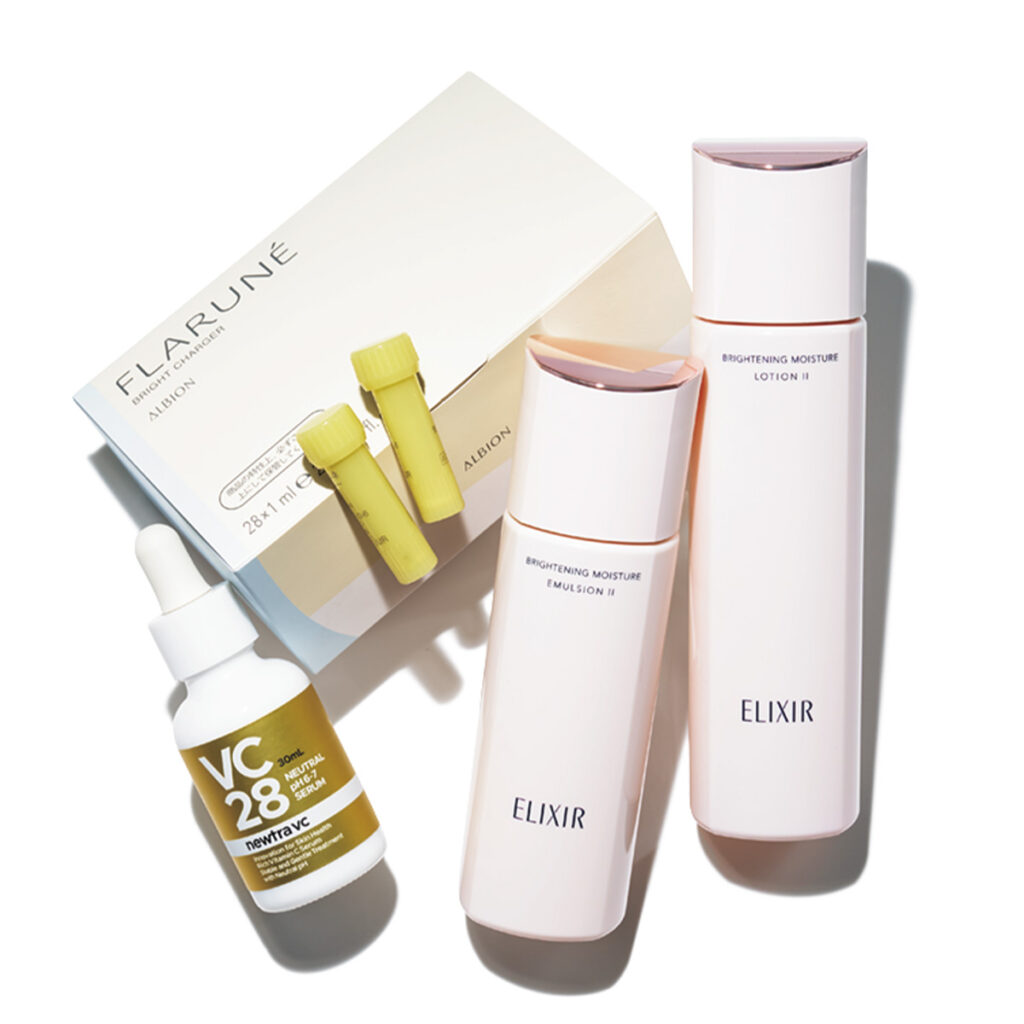 [右から]「朝晩のベーシックケアこそ美白ものに。費用に対しての結果が断トツ」エリクシール ブライトニング ローションWT Ⅱ[医薬部外品]170㎖ ¥3,630、同 ブライトニング エマルジョン WT Ⅱ[医薬部外品]130㎖ ¥4,290(ともにエリクシール) 「28日間の集中ビタミンCでトーンアップ!」フラルネ ブライトチャージャー[医薬部外品]1.0㎖×28本 ¥6,600(アルビオン)※3月17日発売 「最近の激アツ! 毛穴もなくなって、肌の白さも感じるビタミンC美容液」newtra vc 28 30㎖ ¥16,500(マーベセラー)
